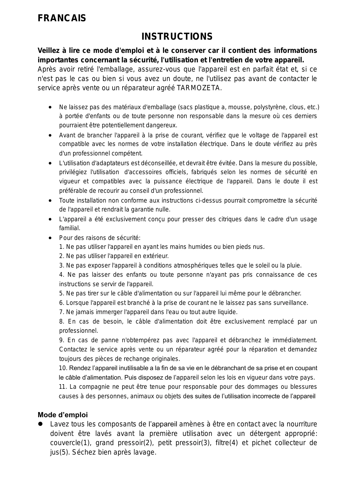 L'appareil a ete exclusivement conqu pour presser des citriques dans le cadre d'un usage familial.