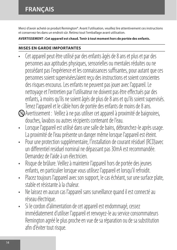 • Cet appareil peut être utilisé par des enfants âgés de 8 ans et plus et par des personnes aux aptitudes physiques, sensorielles ou mentales réduites ou ne possédant pas l’expérience et les connaissances suffisantes, pour autant que ces personnes soient supervisées/aient reçu des instructions et soient conscientes des risques encourus. Les enfants ne peuvent pas jouer avec l’appareil. Le nettoyage et l’entretien par l’utilisateur ne doivent pas être effectués par des enfants, à moins qu’ils ne soient âgés de plus de 8 ans et qu’ils soient supervisés. Tenez l’appareil et le câble hors de portée des enfants de moins de 8 ans. L Avertissement : Veillez à ne pas utiliser cet appareil à proximité de baignoires, douches, lavabos ou autres récipients contenant de l’eau. • Lorsque l’appareil est utilisé dans une salle de bains, débranchez-le après usage. La proximité de l’eau présente un danger même lorsque l’appareil est éteint. • Pour une protection supplémentaire, l’installation de courant résiduel (RCD)avec un differentiel residuel nominal ne dépassant pas 30mA est recommandée. Demandez de l’aide à un électricien. • Risque de brûlure. Veillez à maintenir l’appareil hors de portée des jeunes enfants, en particulier lorsque vous utilisez l’appareil et lorsqu’il refroidit. • Placez toujours l’appareil avec son support, le cas échéant, sur une surface plate, stable et résistante à la chaleur. • Ne laissez en aucun cas l’appareil sans surveillance quand il est connecté au réseau électrique. • Si le cordon d’alimentation de cet appareil est endommagé, cessez immédiatement d’utiliser l’appareil et renvoyez-le au service consommateurs Remington agréé le plus proche en vue de sa réparation ou de sa substitution afin d’éviter tout risque. 14