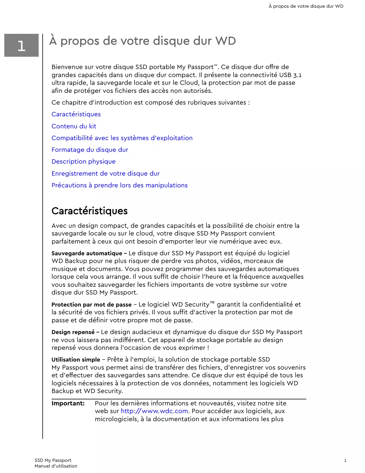 À propos de votre disque dur WD Bienvenue sur votre disque SSD portable My Passport™. Ce disque dur offre de grandes capacités dans un disque dur compact. Il présente la connectivité USB 3.1 ultra rapide, la sauvegarde locale et sur le Cloud, la protection par mot de passe afin de protéger vos fichiers des accès non autorisés. Ce chapitre d'introduction est composé des rubriques suivantes : Caractéristiques Contenu du kit Compatibilité avec les systèmes d'exploitation Formatage du disque dur Description physique Enregistrement de votre disque dur Précautions à prendre lors des manipulations Caractéristiques Avec un design compact, de grandes capacités et la possibilité de choisir entre la sauvegarde locale ou sur le cloud, votre disque SSD My Passport convient parfaitement à ceux qui ont besoin d'emporter leur vie numérique avec eux. Sauvegarde automatique – Le disque dur SSD My Passport est équipé du logiciel WD Backup pour ne plus risquer de perdre vos photos, vidéos, morceaux de musique et documents. Vous pouvez programmer des sauvegardes automatiques lorsque cela vous arrange. Il vous suffit de choisir l'heure et la fréquence auxquelles vous souhaitez sauvegarder les fichiers importants de votre système sur votre disque dur SSD My Passport. Protection par mot de passe – Le logiciel WD Security™ garantit la confidentialité et la sécurité de vos fichiers privés. Il vous suffit d'activer la protection par mot de passe et de définir votre propre mot de passe. Design repensé – Le design audacieux et dynamique du disque dur SSD My Passport ne vous laissera pas indifférent. Cet appareil de stockage portable au design repensé vous donnera l'occasion de vous exprimer ! Utilisation simple – Prête à l'emploi, la solution de stockage portable SSD My Passport vous permet ainsi de transférer des fichiers, d'enregistrer vos souvenirs et d'effectuer des sauvegardes sans attendre. Ce disque dur est équipé de tous les logiciels nécessaires à la protection de vos données, notamment les logiciels WD Backup et WD Security. Important: SSD My Passport Manuel d’utilisation Pour les dernières informations et nouveautés, visitez notre site web sur http://www.wdc.com. Pour accéder aux logiciels, aux micrologiciels, à la documentation et aux informations les plus
