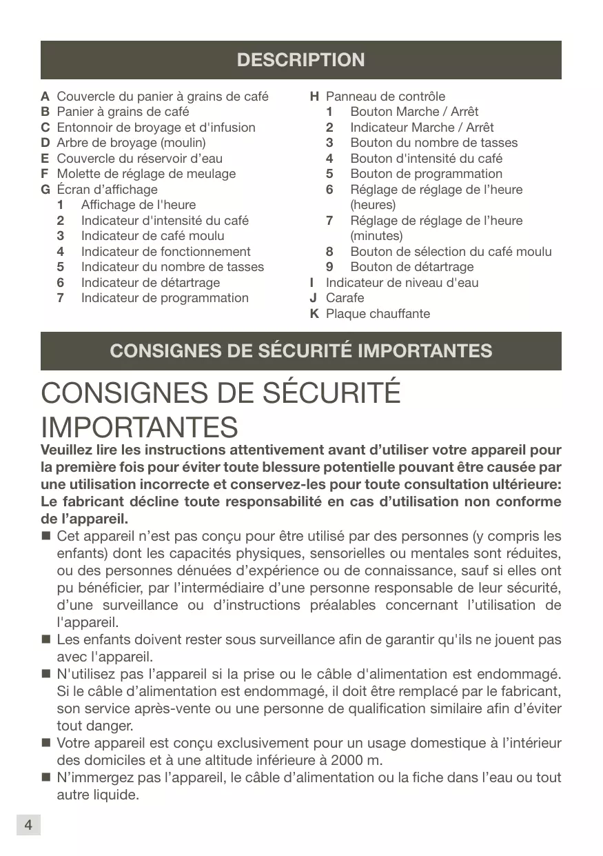 H Panneau de contrôle 1 Bouton Marche / Arrêt 2 Indicateur Marche / Arrêt 3 Bouton du nombre de tasses 4 Bouton d'intensité du café 5 Bouton de programmation 6 Réglage de réglage de l’heure (heures) 7 Réglage de réglage de l’heure (minutes) 8 Bouton de sélection du café moulu 9 Bouton de détartrage I Indicateur de niveau d'eau J Carafe K Plaque chauffante