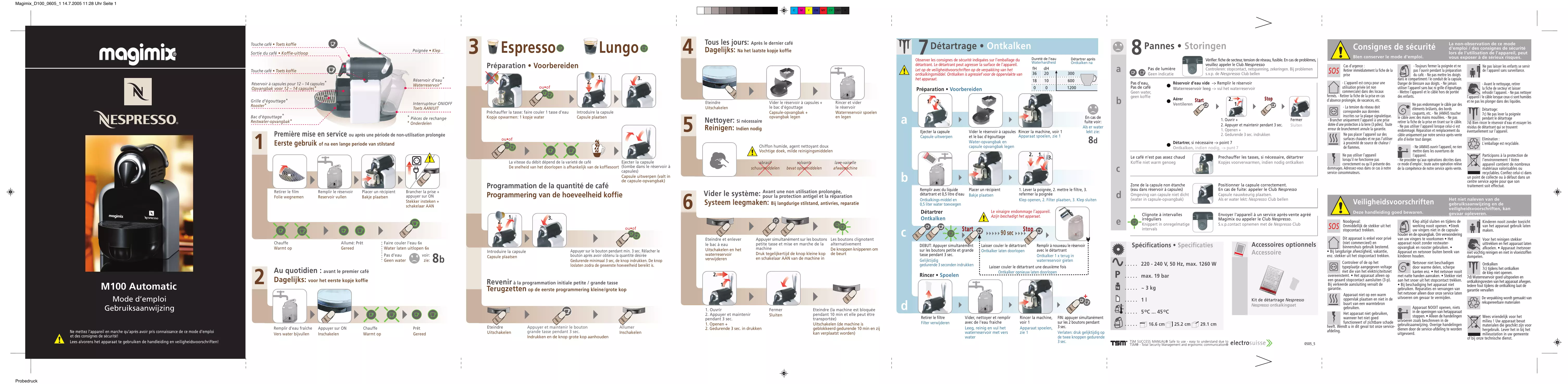 Ne pas endommager le câble par des éléments brûlants, des bords coupants, etc. - Ne JAMAIS toucher le câble avec des mains mouillées. - Ne pas retirer la fiche de la prise en tirant sur le câble. - Ne pas utiliser l'appareil lorsque celui-ci est endommagé. Réparation et remplacement du câble uniquement par notre service après-vente afin d'éviter tout danger. - Ne JAMAIS ouvrir l'appareil, ne rien mettre dans les ouvertures de l'appareil. - Ne procéder qu'aux opérations décrites dans ce mode d'emploi ; toute autre opération relève de la compétence de notre service après-vente. BIen conserver le mode d'emploi. Deze handleiding goed bewaren. Noodgeval: Onmiddellijk de stekker uit het stopcontact trekken. 0505_5 En non-observation cas de non-observation de ce mode de ce mode d'emploi / des consignes de sécurité lors de l'utilisation de l'appareil, peut exposez àà de de sérieux sérieux risques. risques. vous exposer - Toujours fermer la poignée et ne pas l'ouvrir pendant la préparation du café. - Ne pas mettre les doigts dans le compartiment / le conduit de la capsule. Danger de blessure aux doigts. - Ne jamais utiliser l'appareil sans bac ni grille d'égouttage. - Mettre l'appareil et le câble hors de portée des enfants. Veiligheidsvoorschriften Conseils de sécurité Envoyer l'appareil à un service après-vente agréé Magimix ou appeler le Club Nespresso. S.v.p.contact opnemen met de Nespresso Club Spécifications • Specificaties Cas d'urgence : Retirer immédiatement la fiche de la prise - La tension du réseau doit correspondre aux données inscrites sur la plaque signaletique. - Brancher uniquement l'appareil à une prise dotée d'une protection à la terre (3 pôles). Toute erreur de branchement annule la garantie. Ne pas placer l'appareil sur des surfaces chaudes et ne pas l'utiliser à proximité de source de chaleur / de flammes. . . . . . max. 19 bar