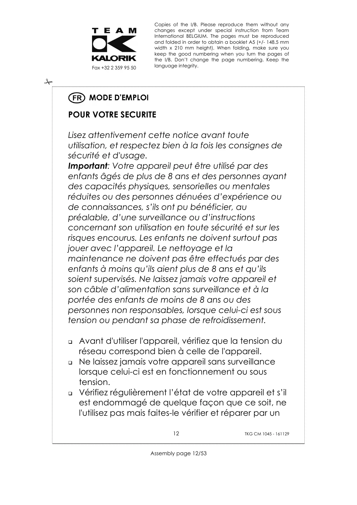Avant d'utiliser l'appareil, vérifiez que la tension du réseau correspond bien à celle de l'appareil. Ne laissez jamais votre appareil sans surveillance lorsque celui-ci est en fonctionnement ou sous tension. Vérifiez régulièrement l’état de votre appareil et s’il est endommagé de quelque façon que ce soit, ne l'utilisez pas mais faites-le vérifier et réparer par un