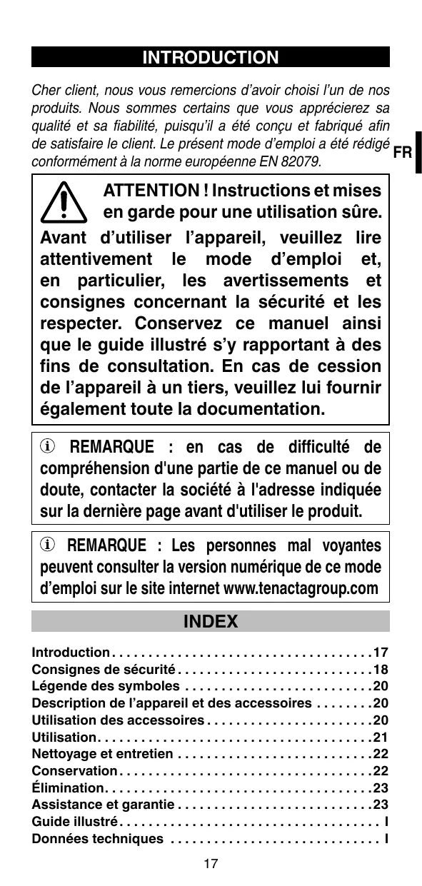 ATTENTION ! Instructions et mises en garde pour une utilisation sûre. Avant d’utiliser l’appareil, veuillez lire attentivement le mode d’emploi et, en particulier, les avertissements et consignes concernant la sécurité et les respecter. Conservez ce manuel ainsi que le guide illustré s’y rapportant à des fins de consultation. En cas de cession de l’appareil à un tiers, veuillez lui fournir également toute la documentation. REMARQUE : en cas de difficulté de compréhension d'une partie de ce manuel ou de doute, contacter la société à l'adresse indiquée sur la dernière page avant d'utiliser le produit. REMARQUE : Les personnes mal voyantes peuvent consulter la version numérique de ce mode d’emploi sur le site internet www.tenactagroup.com