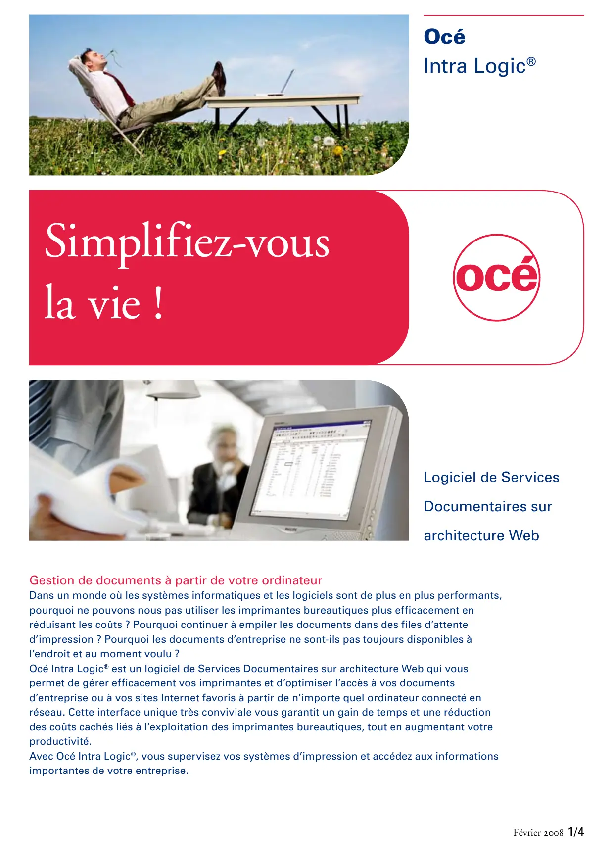 - Peu d’encombrement réseau car pour chaque requête seules quelques lignes de texte sont transmises Pour plus d’informations sur les produits et services Océ, visitez le site www.oce.com/fr Printing for Professionals © Février 2008 Océ-France S.A. Printing for Professionals -- L’Impression Professionnelle. Les illustrations et spécifications ne correspondent pas nécessairement à la livraison standard sur tous les marchés. Océ se réserve le droit de modifier toutes spécifications sans notification préalable. Toutes les marques mentionnées sont la propriété de leurs détenteurs respectifs. Février 2008 4/4