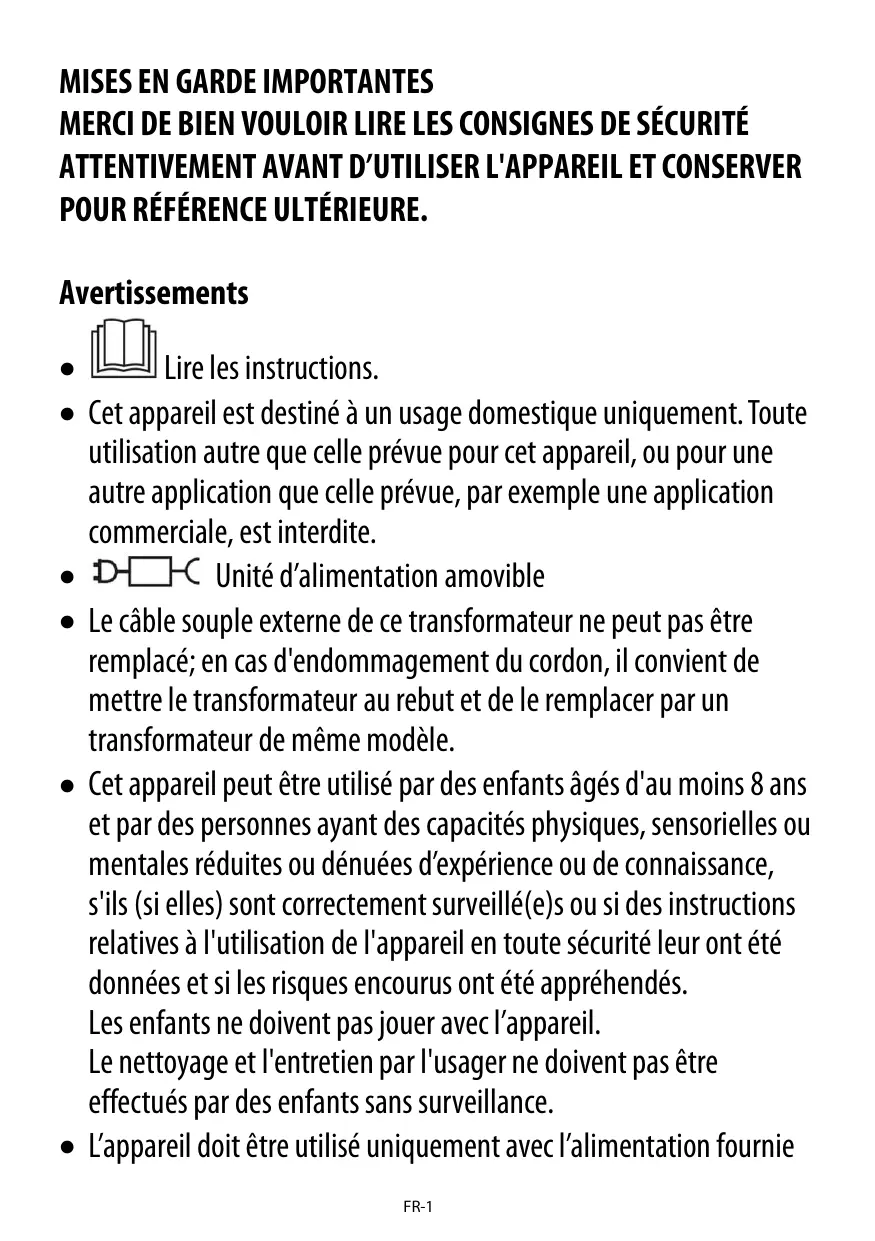 - L'appareil doit être maintainu hors de portée des enfants.