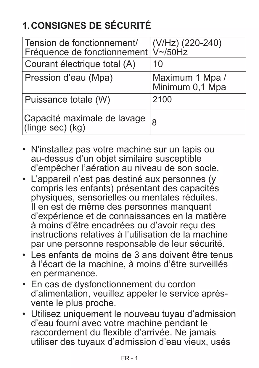 - Il peut y avoir un résidu d’eau dans votre machine à laver neuve. Cela est dû aux contrôles de qualité effectués pendant la production et n’affectera en rien le fonctionnement de votre FR - 3 machine à laver.