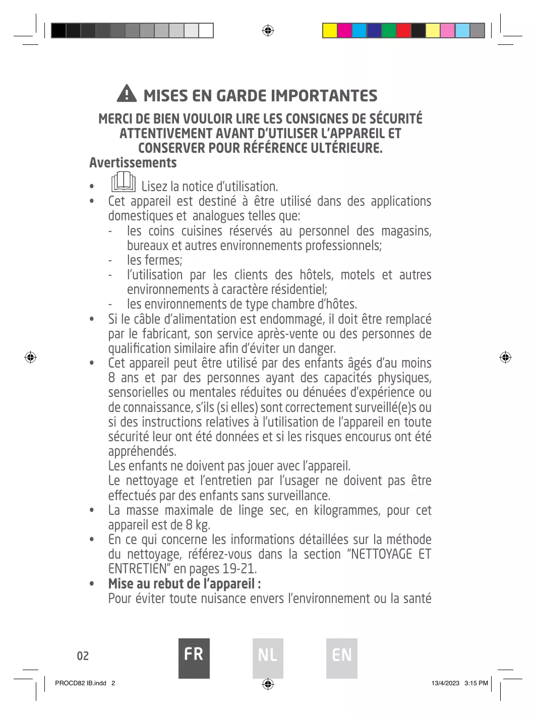 PROCD82 IB.indd 2 Installation et mise en service : L’appareil doit être installé sur le sol, sur une surface plane et horizontale en s’assurant que les ouvertures d’aération sont correctement dégagées. Ne jamais essayer de remplacer ou de réparer vous même une partie ou un composant de l’appareil, demandez de l’aide à un personnel professionnel et qualifié, si besoin. Manipulation : Toujours manipuler l’appareil avec soin afin d’éviter d’endommager celui-ci. Le sèche-linge à tambour ne doit pas être utilisé si des produits chimiques ont été utilisés pour le nettoyage. Le collecteur de bourre doit être nettoyé fréquemment, si cela est applicable. Il ne faut pas laisser de la bourre s’accumuler autour du sèchelinge à tambour. Une ventilation appropriée doit être fournie afin d’éviter un refoulement, à l’intérieur de la pièce, de gaz provenant d’appareils brûlant d’autres combustibles, y compris les feux ouverts. Ne pas sécher dans le sèche-linge à tambour des articles non lavés. Il convient que les articles qui ont été salis avec des substances telles que l’huile de cuisson, l’acétone, l’alcool, l’essence, le kérosène, les détachants, la térébenthine, la cire et les substances pour retirer la cire soient lavés dans de l’eau chaude avec une quantité supplémentaire de détergent avant d’être séchés dans le sèche-linge à tambour. Il convient que les articles comme le caoutchouc mousse (mousse de latex), les bonnets de douche, les textiles étanches, les