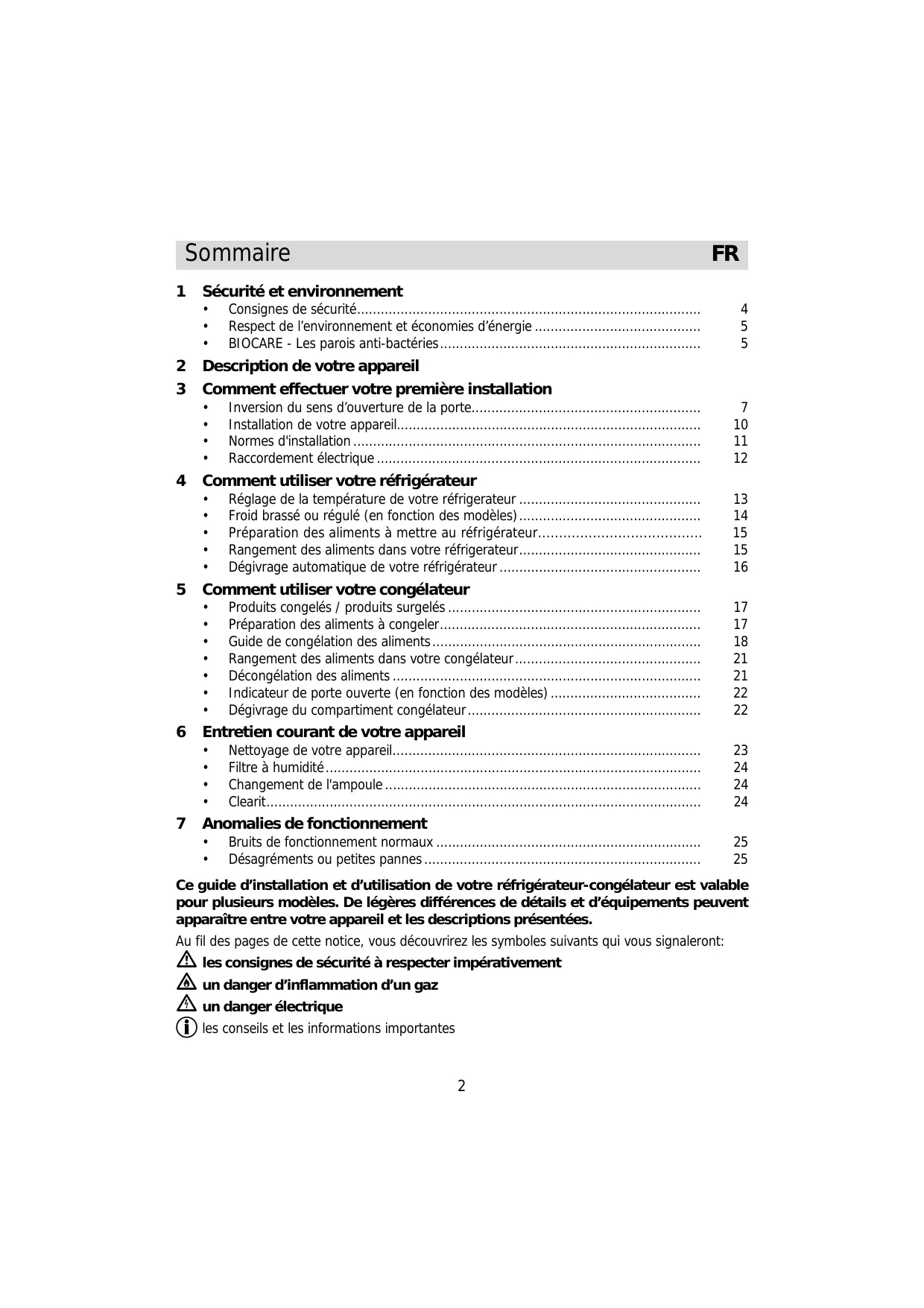 Ce guide d’installation et d’utilisation de votre réfrigérateur-congélateur est valable pour plusieurs modèles. De légères différences de détails et d’équipements peuvent apparaître entre votre appareil et les descriptions présentées. Au fil des pages de cette notice, vous découvrirez les symboles suivants qui vous signaleront: les consignes de sécurité à respecter impérativement un danger d’inflammation d’un gaz un danger électrique les conseils et les informations importantes