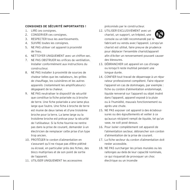 CONSIGNES DE SÉCURITÉ IMPORTANTES ! 1. LIRE ces consignes. 2. CONSERVER ces consignes. 3. RESPECTER tous les avertissements. 4. SUIVRE toutes les consignes. 5. NE PAS utiliser cet appareil à proximité de l’eau. 6. NETTOYER UNIQUEMENT avec un chiffon sec. 7. NE PAS OBSTRUER les orifices de ventilation. Installer conformément aux instructions du constructeur. 8. NE PAS installer à proximité de sources de chaleur telles que les radiateurs, les grilles de chauffage, les cuisinières et les autres appareils (notamment les amplificateurs) dégageant de la chaleur. 9. NE PAS neutraliser le dispositif de sécurité que constitue la fiche polarisée ou à broche de terre. Une fiche polarisée a une lame plus large que l’autre. Une fiche à broche de terre est munie de deux lames et d’une troisième broche pour la terre. La lame large ou la troisième broche est prévue pour la sécurité de l’utilisateur. Si la fiche fournie ne rentre pas dans la prise de courant, demander à un électricien de remplacer cette prise d’un type trop ancien. 10. PROTÉGER le cordon d’alimentation en s’assurant qu’il ne risque pas d’être piétiné ou écrasé, en particulier près des fiches, des blocs multiprises et de son point de sortie de l’appareil. 11. UTILISER UNIQUEMENT les accessoires
