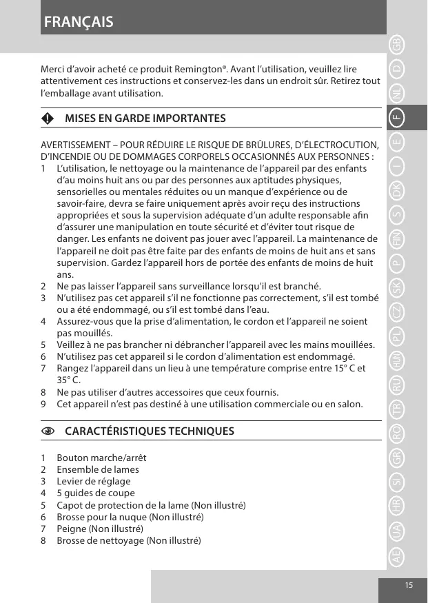 Merci d’avoir acheté ce produit Remington®. Avant l’utilisation, veuillez lire attentivement ces instructions et conservez-les dans un endroit sûr. Retirez tout l’emballage avant utilisation.