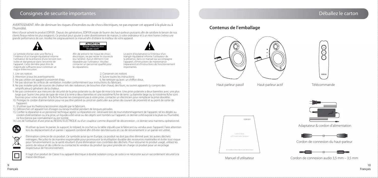 Manual Edition 1.0, Sep. 2013 IB-200-E00250-01 Luna Eclipse Edifier International Ltd., Suite 1610 16th Floor, Tower II, Lippo Centre, 89 Queensway Hong Kong e25-Multimedia Speaker Tel: +852 2522 6989 Fax: +852 2522 1989 www.edifier-international.com 2013 Edifier International Limited. All rights reserved. Printed in China NOTICE: For the need of technical improvement and system upgrade,information contained herein may be subject to change from time to time without prior notice. Products of EDIFIER will be customized for different applications. Pictures and illustrations shown on this manual may be slightly different from actual product. If any difference is found, the actual product prevails. User manual | Manuel d’utilisateur | Manual de usuario | Manual do utilizador Consignes de securite importantes Déballez le carton AVERTISSEMENT: Afin de diminuer les risques d’incendies ou de chocs électriques, ne pas exposer cet appareil à la pluie ou à l’humidité. Contenus de l’emballage Merci d’avoir acheté le produit EDIFIER . Depuis des générations, EDIFIER essaie de fournir des haut-parleurs puissants afin de satisfaire le besoin de nos clients finaux même les plus exigeants. Ce produit peut ajouter à votre divertissement de maison, à votre ordinateur et à un mini home cinéma une grande performance de son. Veuillez lire soigneusement ce manuel afin d’obtenir le meilleur de votre appareil. Risque d’électrocution ne pas ouvrir Le symbole d’éclair avec une flèche à l’intérieur d’un triangle équilatéral informe l’utilisateur de la présence d’une tension non isolée et dangereuse dans l’enceinte de l’appareil. Cette dernière peut être de magnitude suffisante pour constituer un risque d’électrocution. Afin de prévenir les risque de chocs électriques, ne pas retirer le couvercle (ou l’arrière). Aucun élément n’est réparable par l’utilisateur. Veuillez contacter un personnel qualifié pour les réparations. Le point d’exclamation à l’intérieur d’un triangle équilatéral informe l’utilisateur de la présence, dans ce manuel qui accompagne l’appareil, d’instructions de maintenance (réparation) et d’instructions de fonctionnement importantes.