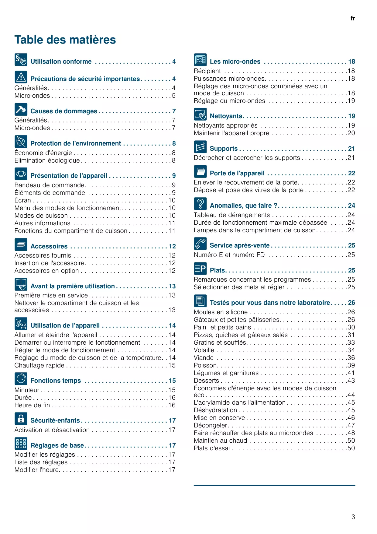 Minuteur . . . . . . . . . . . . . . . . . . . . . . . . . . . . . . . . . . . 15 Durée . . . . . . . . . . . . . . . . . . . . . . . . . . . . . . . . . . . . . 16 Heure de fin . . . . . . . . . . . . . . . . . . . . . . . . . . . . . . . . 16 A Sécurité-enfants . . . . . . . . . . . . . . . . . . . . . . . . . 17 Activation et désactivation . . . . . . . . . . . . . . . . . . . . . 17 Q Réglages de base. . . . . . . . . . . . . . . . . . . . . . . . 17 Modifier les réglages . . . . . . . . . . . . . . . . . . . . . . . . . 17 Liste des réglages . . . . . . . . . . . . . . . . . . . . . . . . . . . 17 Modifier l'heure. . . . . . . . . . . . . . . . . . . . . . . . . . . . . . 17 3 Anomalies, que faire ?. . . . . . . . . . . . . . . . . . . . 24 Tableau de dérangements . . . . . . . . . . . . . . . . . . . . .24 Durée de fonctionnement maximale dépassée . . . . .24 Lampes dans le compartiment de cuisson. . . . . . . . .24 Moules en silicone . . . . . . . . . . . . . . . . . . . . . . . . . Gâteaux et petites pâtisseries. . . . . . . . . . . . . . . . . Pain et petits pains . . . . . . . . . . . . . . . . . . . . . . . . Pizzas, quiches et gâteaux salés . . . . . . . . . . . . . . Gratins et soufflés. . . . . . . . . . . . . . . . . . . . . . . . . . Volaille . . . . . . . . . . . . . . . . . . . . . . . . . . . . . . . . . . Viande . . . . . . . . . . . . . . . . . . . . . . . . . . . . . . . . . . Poisson. . . . . . . . . . . . . . . . . . . . . . . . . . . . . . . . . . Légumes et garnitures . . . . . . . . . . . . . . . . . . . . . . Desserts . . . . . . . . . . . . . . . . . . . . . . . . . . . . . . . . . Économies d'énergie avec les modes de cuisson éco . . . . . . . . . . . . . . . . . . . . . . . . . . . . . . . . . . . . . L'acrylamide dans l'alimentation . . . . . . . . . . . . . . . Déshydratation . . . . . . . . . . . . . . . . . . . . . . . . . . . . Mise en conserve . . . . . . . . . . . . . . . . . . . . . . . . . . Décongeler . . . . . . . . . . . . . . . . . . . . . . . . . . . . . . . Faire réchauffer des plats au microondes . . . . . . . Maintien au chaud . . . . . . . . . . . . . . . . . . . . . . . . . Plats d'essai . . . . . . . . . . . . . . . . . . . . . . . . . . . . . .