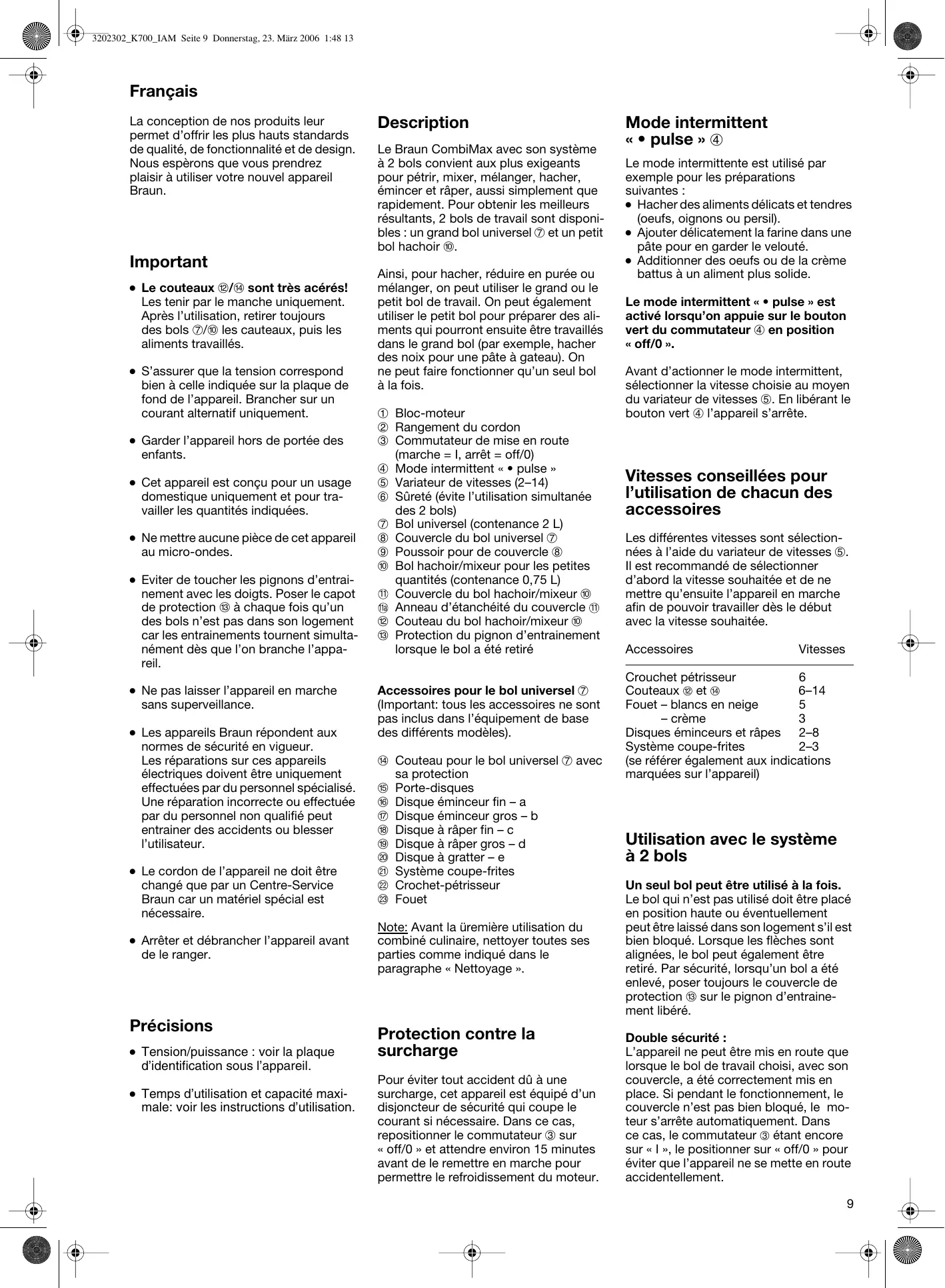 3202302_K700_IAM Seite 9 Donnerstag, 23. März 2006 1:48 13 Français La conception de nos produits leur permet d’offrir les plus hauts standards de qualité, de fonctionnalité et de design. Nous espèrons que vous prendrez plaisir à utiliser votre nouvel appareil Braun. Important