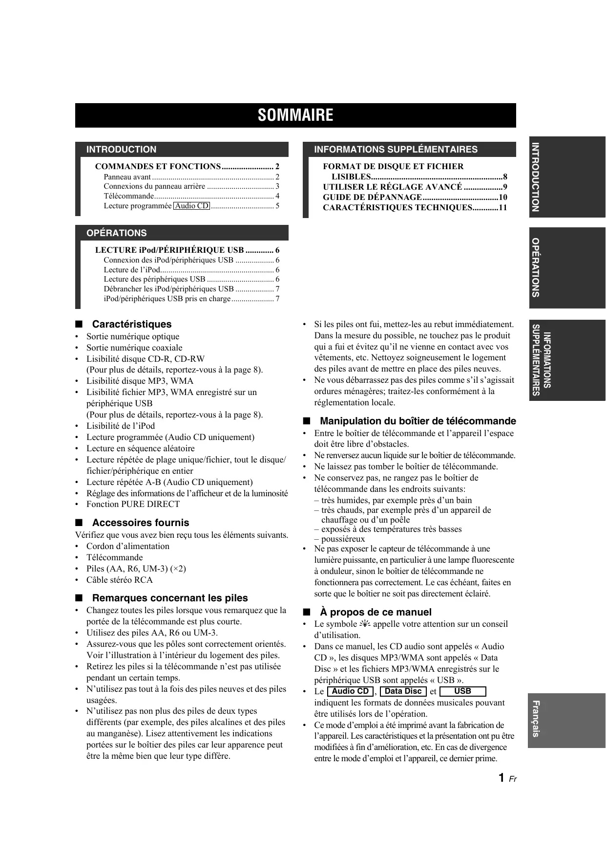 • Dans ce manuel, les CD audio sont appelés « Audio CD », les disques MP3/WMA sont appelés « Data Disc » et les fichiers MP3/WMA enregistrés sur le périphérique USB sont appelés « USB ». USB
