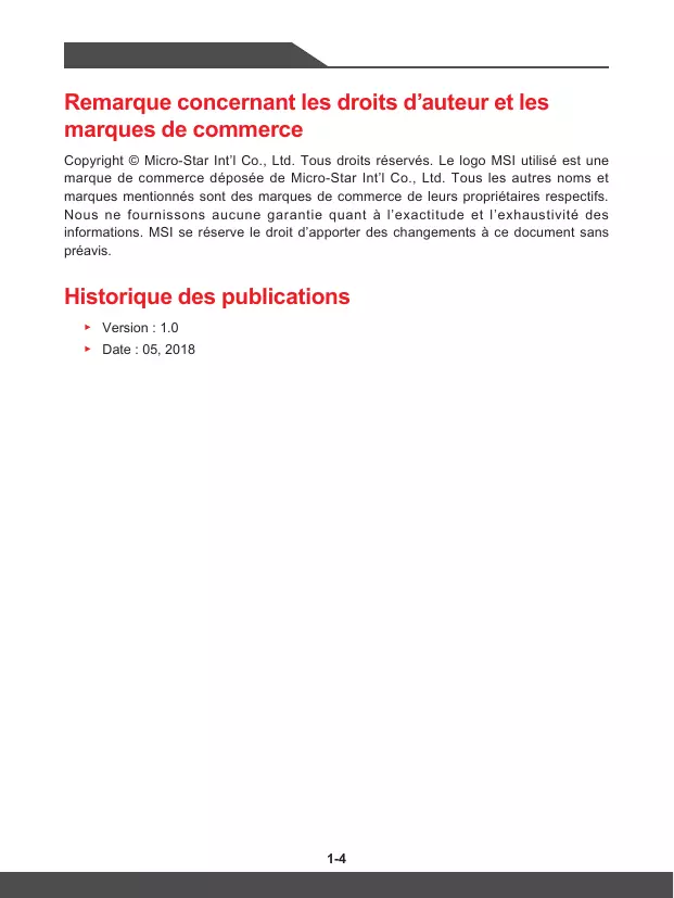 Copyright © Micro-Star Int'l Co., Ltd. Tous droits réservés. Le logo MSI utilisé est une marque de commerce déposée de Micro-Star Int'l Co., Ltd. Tous les autres noms et marques mentionnés sont des marques de commerce de leurs propriétaires respectifs. Nous ne fournissons aucune garantie quant à l'exactitude et l'exhaustivité des informations. MSI se reserve le droit d'apporter des changements à ce document sans préavis.