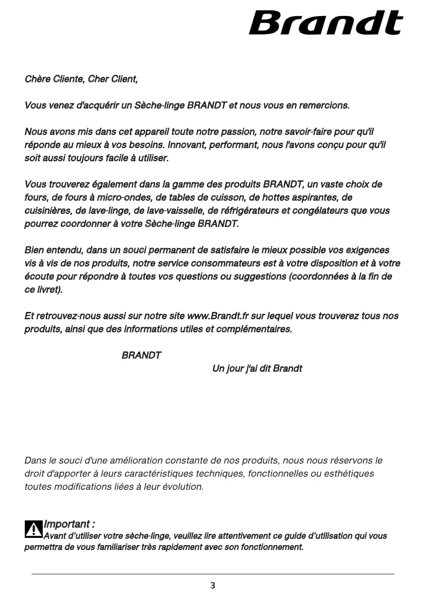 Chère Cliente, Cher Client, ous venez d'accqu uérir un Sècche-llinge BRANDT et nous vous en remerccio ons. ous avo ons mis dans cet appareil toute notre passio on, notre savo oir-ffaire pour qu'il oins. Inno ovant, perfo ormant, nous l'avo ons conçu u pour qu'il répo onde au mieu ux à vos beso oit aussi toujo ours faccile à utiliser. ous tro ouverez également dans la gamme des pro odu uits BRANDT, un vaste cho oix de ours, de fours à miccro o-o ondes, de tables de cuisso on, de hottes aspirantes, de cuisinières, de lave-llinge, de lave-vvaisselle, de réfrigérateu urs et congélateu urs que vous ourrez coordo onner à votre Sècche-llinge BRANDT. Bien entendu u, dans un souci permanent de satisfaire le mieu ux possible vos exigencces vis à vis de nos pro odu uits, notre servicce conso ommateu urs est à votre dispo ositio on et à votre éccoute pour répo ondre à toutes vos questio ons ou suggestio ons (coordo onnées à la fin de ce livret). Et retro ouvez-n nous aussi sur notre site www.Brandt.fr sur lequ uel vous tro ouverez tous nos pro odu uits, ainsi que des info ormatio ons utiles et complémentaires. BRANDT Un jour j'ai dit Brandt Dans le souci d'une amélioration constante de nos produits, nous nous réservons le droit d'apporter à leurs caractéristiques techniques, fonctionnelles ou esthétiques toutes modifications liées à leur évolution. Important : Avant d’utiiliser votre sèch he-llinge, veuiillez lire attentiivement ce guiide d’utiilisatiion quii vous permettra de vous famiiliariiser très rapiidement avec son fonctiionnement.