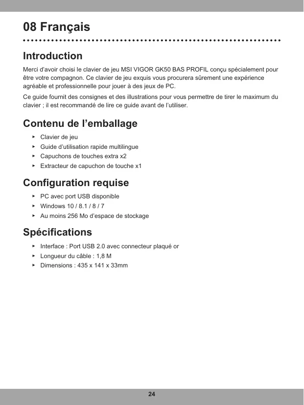 GAMING KEYBOARD 08 Français Introduction Merci d’avoir choisi le clavier de jeu MSI VIGOR GK50 BAS PROFIL conçu spécialement pour être votre compagnon. Ce clavier de jeu exquis vous procurera sûrement une expérience agréable et professionnelle pour jouer à des jeux de PC. Ce guide fournit des consignes et des illustrations pour vous permettre de tirer le maximum du clavier ; il est recommandé de lire ce guide avant de l’utiliser. Contenu de l’emballage ▶ Clavier de jeu ▶ Guide d’utilisation rapide multilingue ▶ Capuchons de touches extra x2 ▶ Extracteur de capuchon de touche x1 Configuration requise ▶ PC avec port USB disponible ▶ Windows 10 / 8.1 / 8 / 7 ▶ Au moins 256 Mo d’espace de stockage Spécifications ▶ Interface : Port USB 2.0 avec connecteur plaqué or ▶ Longueur du câble : 1,8 M ▶ Dimensions : 435 x 141 x 33mm