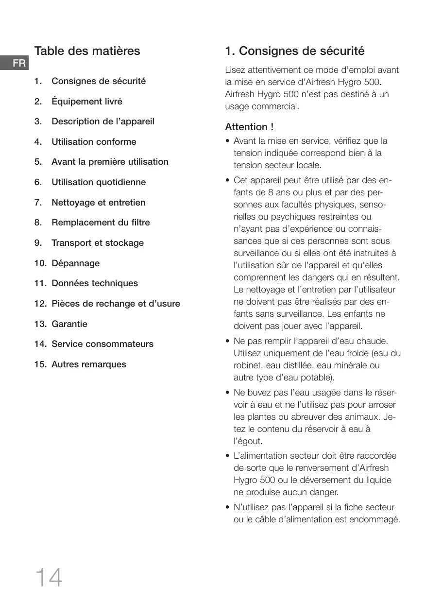 - L'alimentation secteur doit être raccordée de sorte que le renversement d'Airfresh Hygro 500 ou le déversement du liquide ne produit aucun danger.