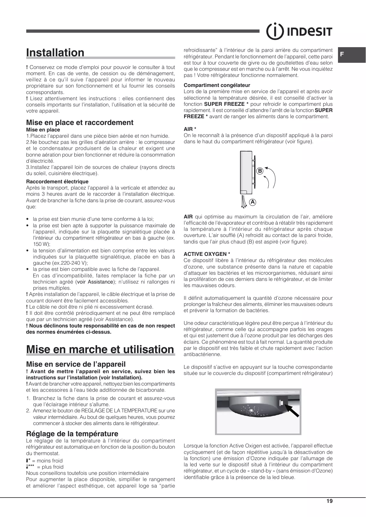 1.Placez l’appareil dans une pièce bien aérée et non humide. 2.Ne bouchez pas les grilles d’aération arrière : le compresseur et le condensateur produisent de la chaleur et exigent une bonne aération pour bien fonctionner et réduire la consommation d’électricité. 3.Installez l’appareil loin de sources de chaleur (rayons directs du soleil, cuisinière électrique). Raccordement électrique Après le transport, placez l’appareil à la verticale et attendez au moins 3 heures avant de le raccorder à l’installation électrique. Avant de brancher la fiche dans la prise de courant, assurez-vous que: • la prise est bien munie d’une terre conforme à la loi; • la prise est bien apte à supporter la puissance maximale de l’appareil, indiquée sur la plaquette signalétique placée à l’intérieur du compartiment réfrigérateur en bas à gauche (ex. 150 W); • la tension d’alimentation est bien comprise entre les valeurs indiquées sur la plaquette signalétique, placée en bas à gauche (ex.220-240 V); • la prise est bien compatible avec la fiche de l’appareil. En cas d’incompatibilité, faites remplacer la fiche par un technicien agréé (voir Assistance); n’utilisez ni rallonges ni prises multiples. ! Après installation de l’appareil, le câble électrique et la prise de courant doivent être facilement accessibles. ! Le câble ne doit être ni plié ni excessivement écrasé. ! Il doit être contrôlé prériodiquement et ne peut être remplacé que par un technicien agréé (voir Assistance). ! Nous déclinons toute responsabilité en cas de non respect des normes énumérées ci-dessus.