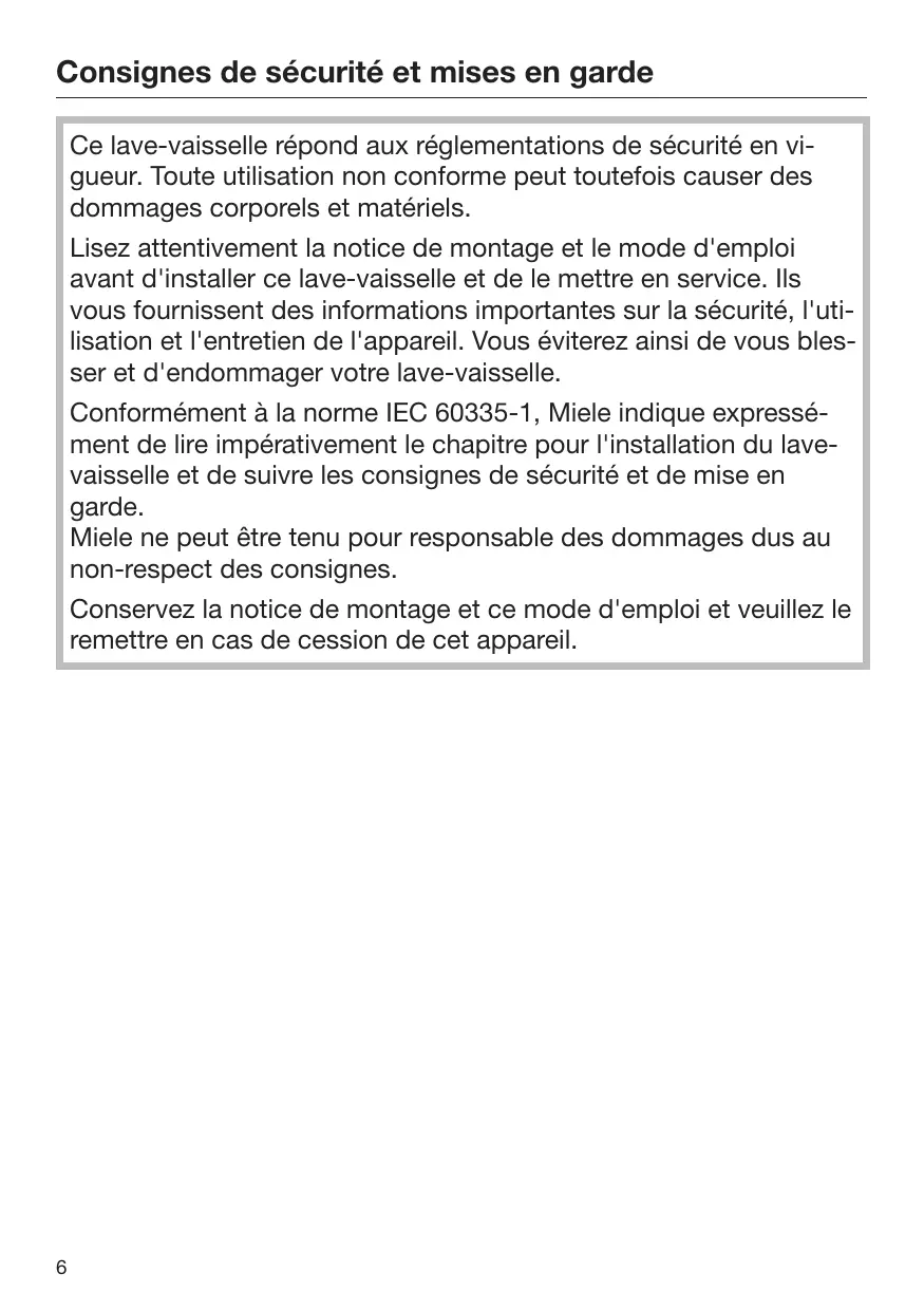 Consignes de sécurité et mises en garde Ce lave-vaisselle répond aux réglementations de sécurité en vigueur. Toute utilisation non conforme peut toutefois causer des dommages corporels et matériels. Lisez attentivement la notice de montage et le mode d'emploi avant d'installer ce lave-vaisselle et de le mettre en service. Ils vous fournissent des informations importantes sur la sécurité, l'utilisation et l'entretien de l'appareil. Vous éviterez ainsi de vous blesser et d'endommager votre lave-vaisselle. Conformément à la norme IEC 60335-1, Miele indique expressément de lire impérativement le chapitre pour l'installation du lavevaisselle et de suivre les consignes de sécurité et de mise en garde. Miele ne peut être tenu pour responsable des dommages dus au non-respect des consignes. Conservez la notice de montage et ce mode d'emploi et veuillez le remettre en cas de cession de cet appareil.