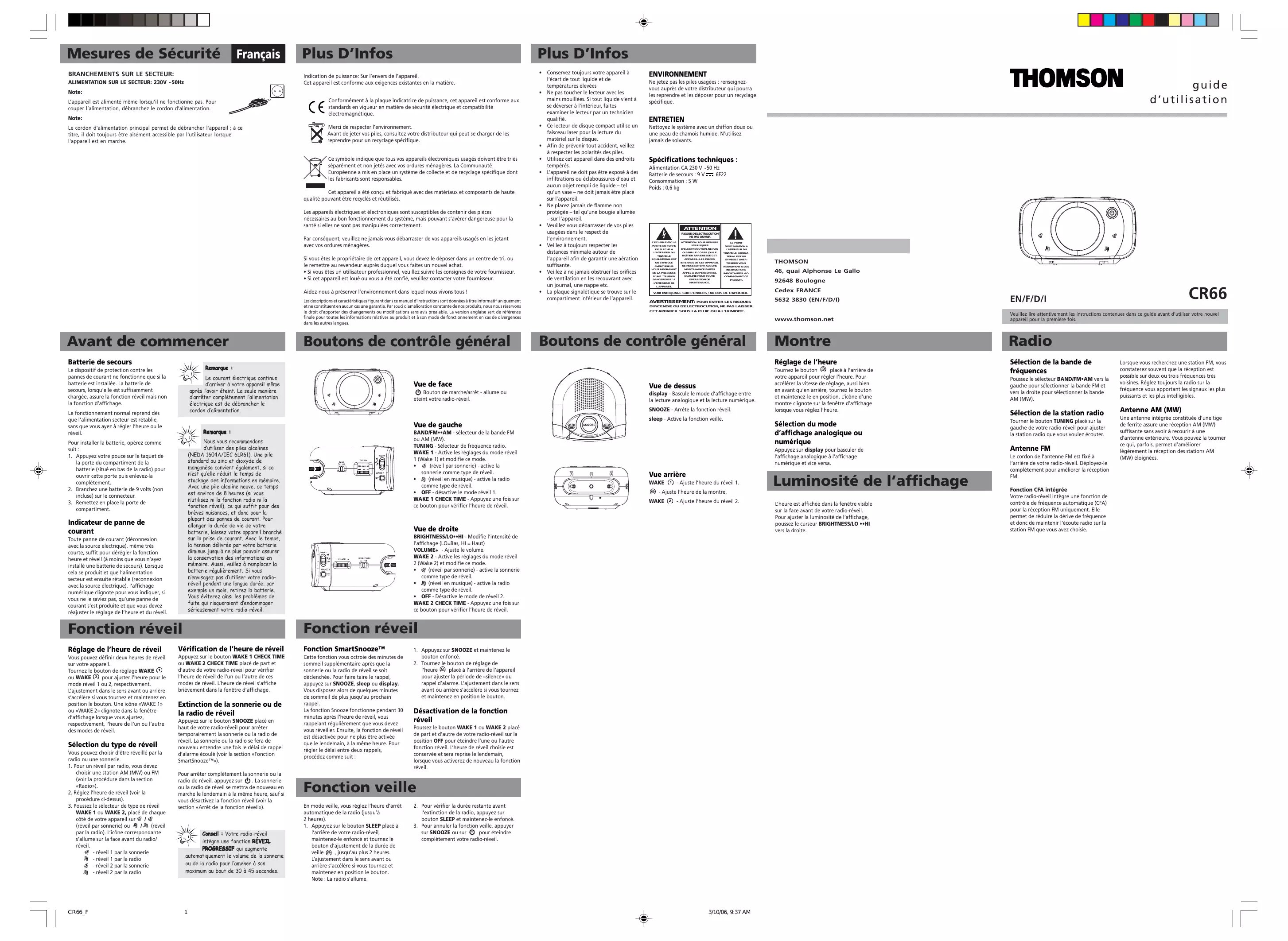 sur SNOOZE ou sur pour éteindre complètement votre radio-réveil. 3/10/06, 9:37 AM CR66 Cedex FRANCE 5632 3830 (EN/F/D/I) EN/F/D/I www.thomson.net Veuillez lire attentivement les instructions contenues dans ce guide avant d’utiliser votre nouvel appareil pour la première fois. Montre Radio Réglage de l’heure Sélection de la bande de fréquences Tournez le bouton placé à l’arrière de votre appareil pour régler l’heure. Pour accélérer la vitesse de réglage, aussi bien en avant qu’en arrière, tournez le bouton et maintenez-le en position. L’icône d’une montre clignote sur la fenêtre d’affichage lorsque vous réglez l’heure. Sélection du mode d’affichage analogique ou numérique Luminosité de l’affichage - Ajuste l’heure de la montre. Vue de droite Réglage de l’heure de réveil 46, quai Alphonse Le Gallo Appuyez sur display pour basculer de l’affichage analogique à l’affichage numérique et vice versa. Fonction réveil Fonction réveil THOMSON