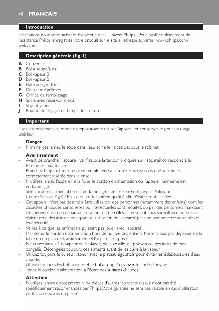 N'utilisez jamais d'accessoires, ni de pieces d'autres fabricants ou qui n ont pas eté spécifiquement recommendés par Philips. Voitre garantie ne sera pas valable en cas d'utilisation de tels accessoires ou pieces.