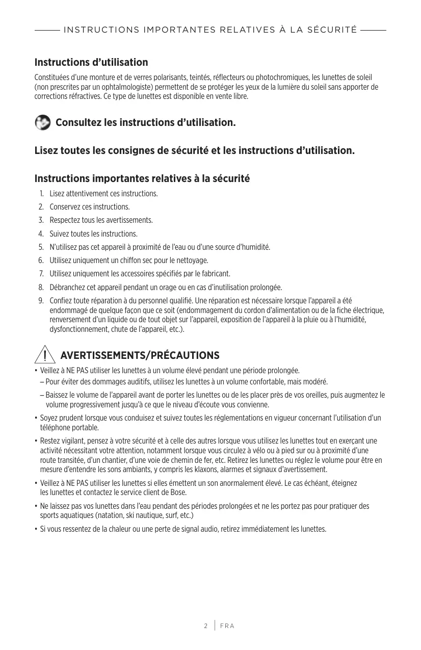 • Veillez à NE PAS utiliser les lunettes à un volume élevé pendant une période prolongée. ––Pour éviter des dommages auditifs, utilisez les lunettes à un volume confortable, mais modéré. ––Baissez le volume de l’appareil avant de porter les lunettes ou de les placer près de vos oreilles, puis augmentez le volume progressivement jusqu’à ce que le niveau d’écoute vous convienne. • Soyez prudent lorsque vous conduisez et suivez toutes les réglementations en vigueur concernant l’utilisation d’un téléphone portable. • Restez vigilant, pensez à votre sécurité et à celle des autres lorsque vous utilisez les lunettes tout en exerçant une activité nécessitant votre attention, notamment lorsque vous circulez à vélo ou à pied sur ou à proximité d’une route transitée, d’un chantier, d’une voie de chemin de fer, etc. Retirez les lunettes ou réglez le volume pour être en mesure d’entendre les sons ambiants, y compris les klaxons, alarmes et signaux d’avertissement. • Veillez à NE PAS utiliser les lunettes si elles émettent un son anormalement élevé. Le cas échéant, éteignez les lunettes et contactez le service client de Bose. • Ne laissez pas vos lunettes dans l’eau pendant des périodes prolongées et ne les portez pas pour pratiquer des sports aquatiques (natation, ski nautique, surf, etc.) • Si vous ressentez de la chaleur ou une perte de signal audio, retirez immédiatement les lunettes.
