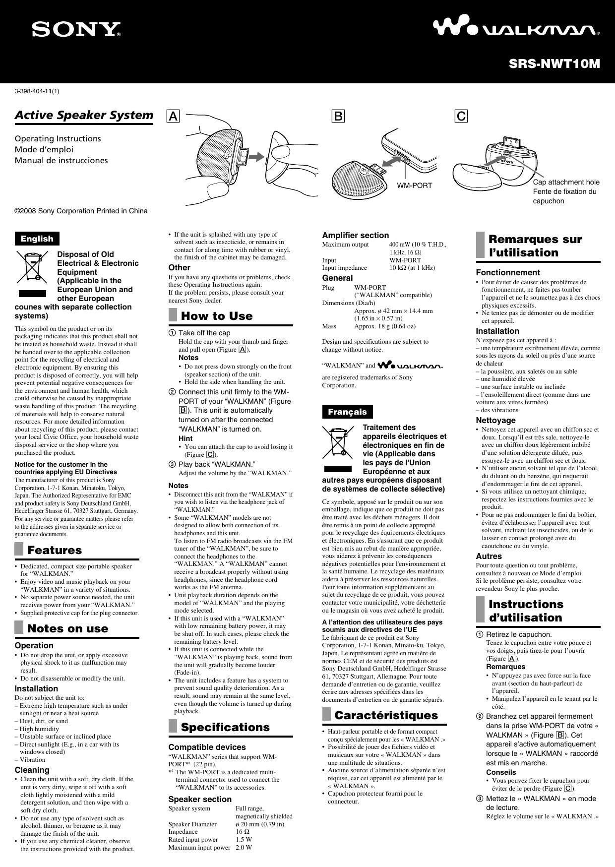 SRS-NWT10M - Enceinte bluetooth SONY - Notice d'utilisation et mode d'emploi gratuit