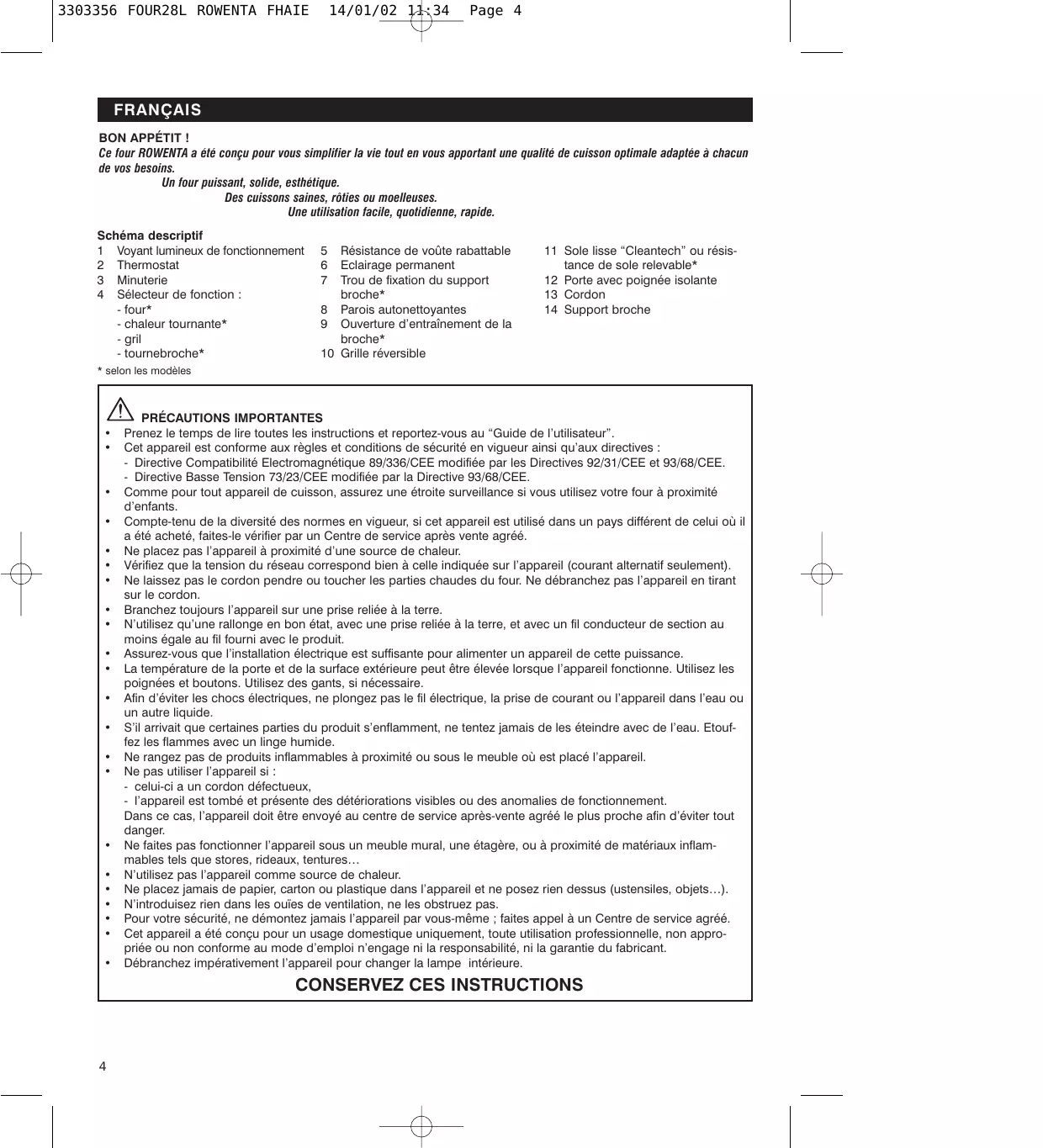 FRANÇAIS BON APPÉTIT ! Ce four ROWENTA a été conçu pour vous simplifier la vie tout en vous apportant une qualité de cuisson optimale adaptée à chacun de vos besoins. Un four puissant, solide, esthétique. Des cuissons saines, rôties ou moelleuses. Une utilisation facile, quotidienne, rapide. Schéma descriptif 1 Voyant lumineux de fonctionnement 2 Thermostat 3 Minuterie 4 Sélecteur de fonction : - four* - chaleur tournante* - gril - tournebroche*