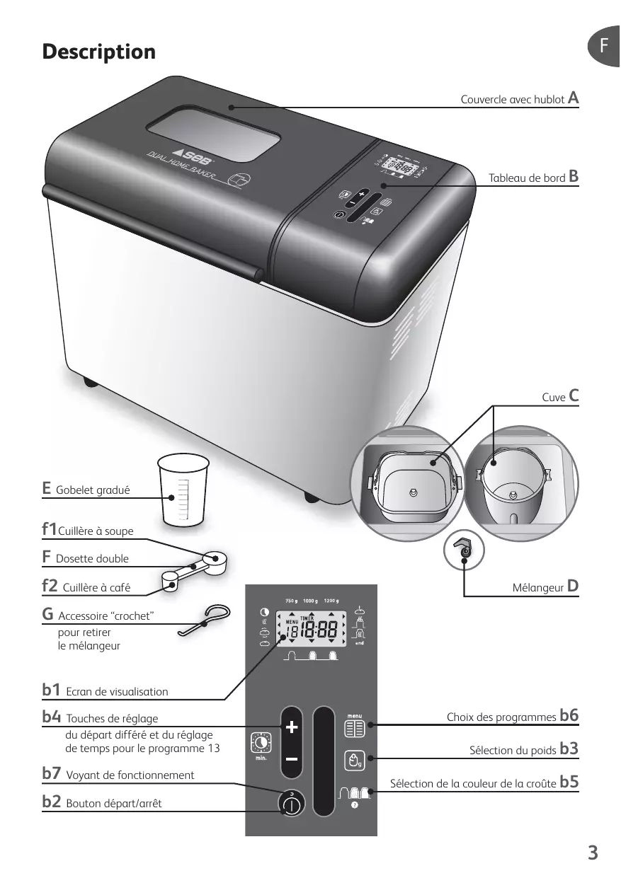 Description Couvercle avec hublot A Tableau de bord B min. menu Cuve C E Gobelet gradué f1Cuillère à soupe F Dosette double f2 Cuillère à café Mélangeur D G Accessoire “crochet” pour retirer le mélangeur b1 Ecran de visualisation b4 Touches de réglage du départ différé et du réglage de temps pour le programme 13 b7 Voyant de fonctionnement Choix des programmes b6 Sélection du poids b3 Sélection de la couleur de la croûte b5 b2 Bouton départ/arrêt