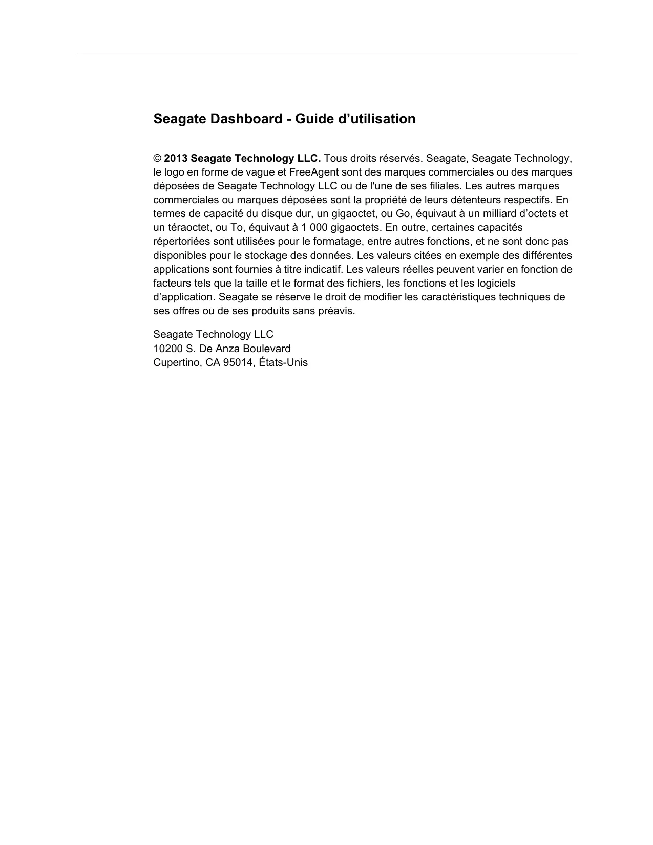 Seagate Dashboard - Guide d'utilisation Seagate Dashboard - Guide d’utilisation © 2013 Seagate Technology LLC. Tous droits réservés. Seagate, Seagate Technology, le logo en forme de vague et FreeAgent sont des marques commerciales ou des marques déposées de Seagate Technology LLC ou de l'une de ses filiales. Les autres marques commerciales ou marques déposées sont la propriété de leurs détenteurs respectifs. En termes de capacité du disque dur, un gigaoctet, ou Go, équivaut à un milliard d’octets et un téraoctet, ou To, équivaut à 1 000 gigaoctets. En outre, certaines capacités répertoriées sont utilisées pour le formatage, entre autres fonctions, et ne sont donc pas disponibles pour le stockage des données. Les valeurs citées en exemple des différentes applications sont fournies à titre indicatif. Les valeurs réelles peuvent varier en fonction de facteurs tels que la taille et le format des fichiers, les fonctions et les logiciels d’application. Seagate se réserve le droit de modifier les caractéristiques techniques de ses offres ou de ses produits sans préavis. Seagate Technology LLC 10200 S. De Anza Boulevard Cupertino, CA 95014, États-Unis Contenu
