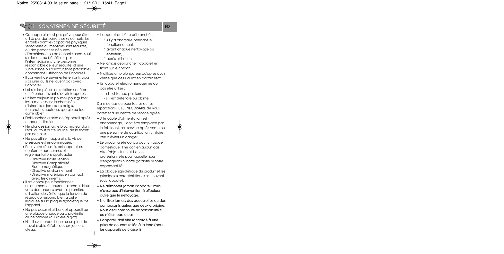 - Pour votre sécurité, cet appareil est conforme aux normes et reglementations applicables : - Directive Basse Tension - Directive Compatibilité Electromagnétique - Directive environnement - Directive matériaux en contact avec les aliments.