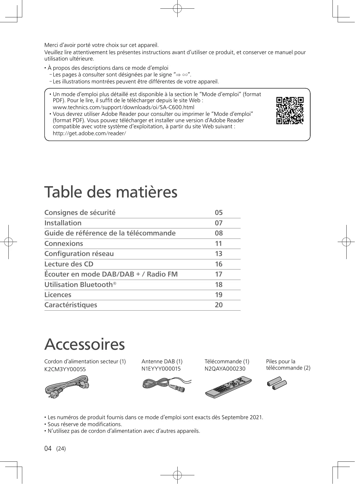 Un mode d'emploi plus détaillé est disponible à la section le "Mode d'emploi" (format PDF). Pour le litre, il suffit de le télécharger depuis le site Web : www.technics.com/support/downloads/oi/SA-C600.html