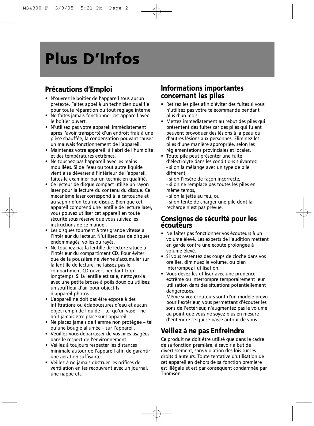MS4300 F 3/9/05 5:21 PM Page 2 Plus D’Infos Précautions d‘Emploi