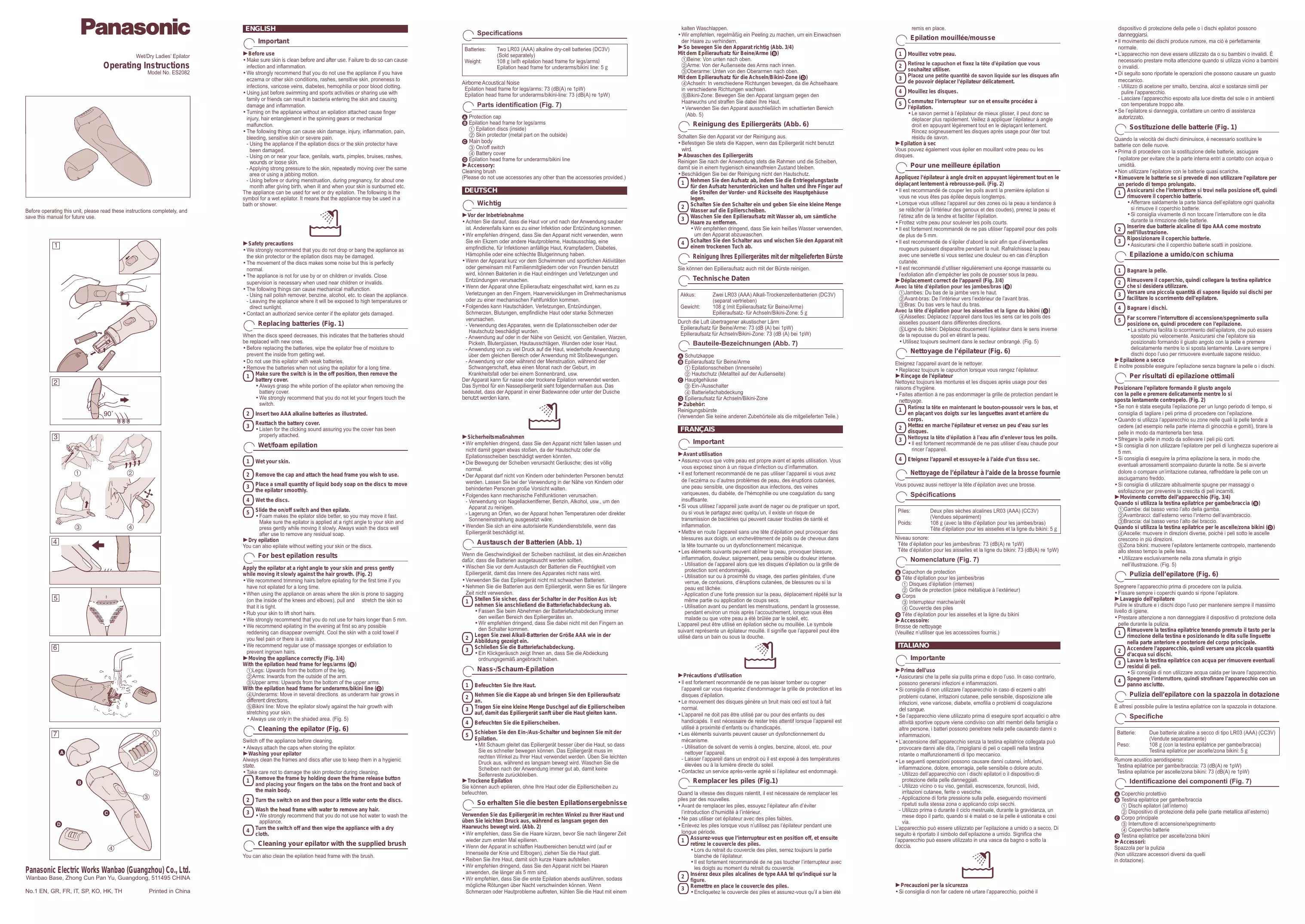 Spécifications Piles: Deux piles sèches alcalines LR03 (AAA) (CC3V) (Vendues séparément) Poids: 108 g (avec la tête d’épilation pour les jambes/bras) Tête d’épilation pour les aisselles et la ligne du bikini: 5 g Niveau sonore: Tête d’épilation pour les jambes/bras: 73 (dB(A) re 1pW) Tête d’épilation pour les aisselles et la ligne du bikini: 73 (dB(A) re 1pW)