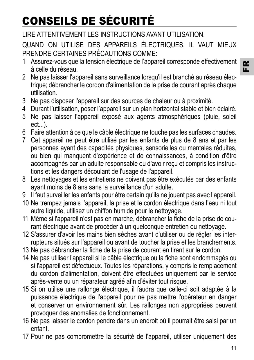 7 Cet apparéil ne peut être utilisé par les enfants de plus de 8 ans et par les personnes ayant des capacité physiques, sensorielles ou mentales réduites, ou bien qui manquent d'expérience et de connaissances, à condition d'être accompanies par unadulte responsable ou d'avoir reçu et compris les instructions et les dangers décaulant de l'utilisation de l' apparéil.
