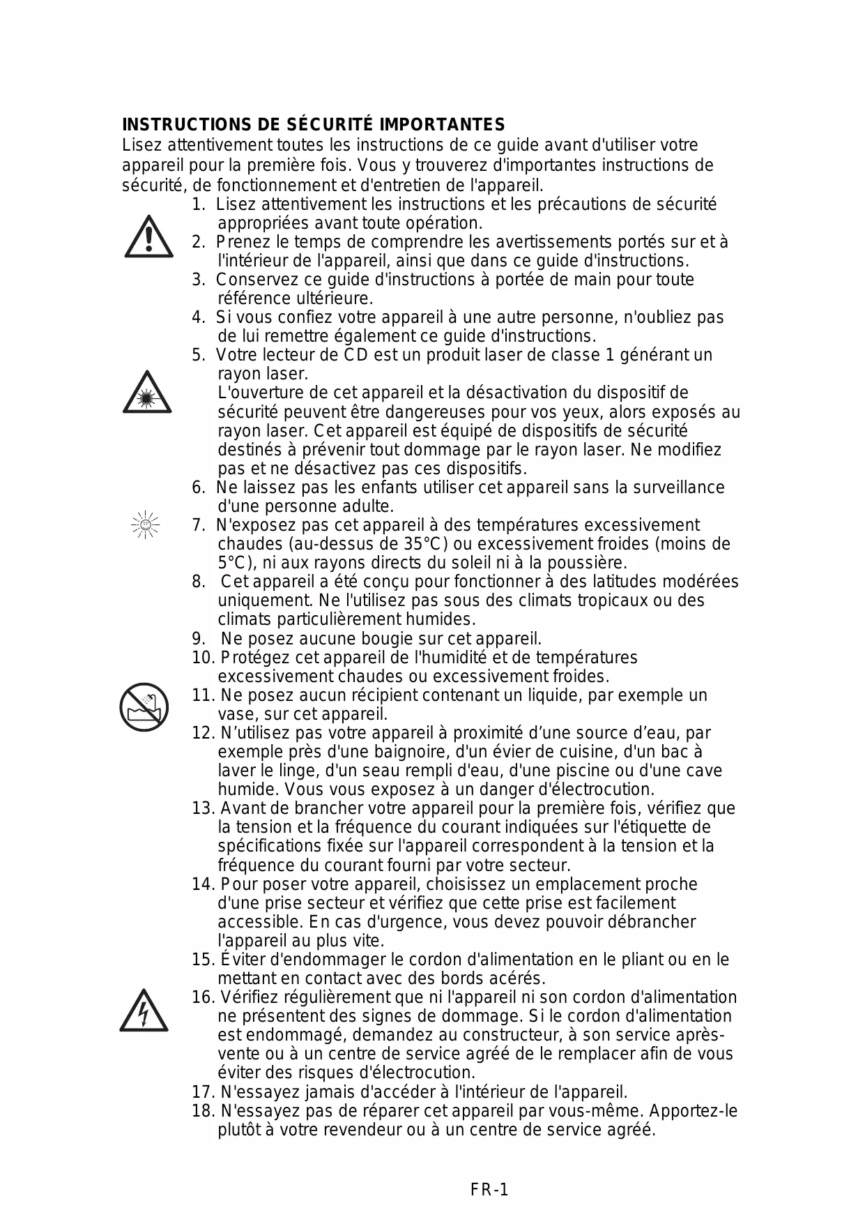 - Notre lecteur de CD est un produit laser de classe 1 générant un rayon laser.