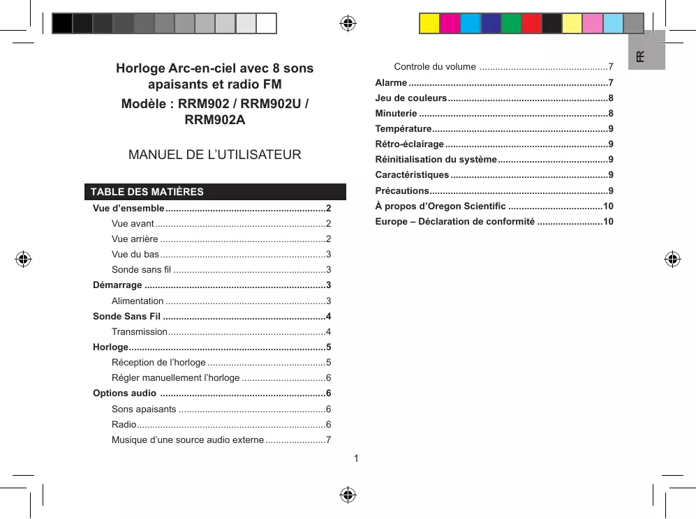 EUROPE – DÉCLARATION DE CONFORMITÉ Par la présente Oregon Scientific déclare que l'appareil Horloge Arc-en-ciel avec 8 sons apaisants et radio FM (modèle: RRM902 / RRM902U / RRM902A) est conforme aux exigences essentielles et aux autres dispositions pertinentes de la directive 1999/5/CE. Une copie signée et datée de la déclaration de conformité est disponible sur demande auprès de notre Service Client.
