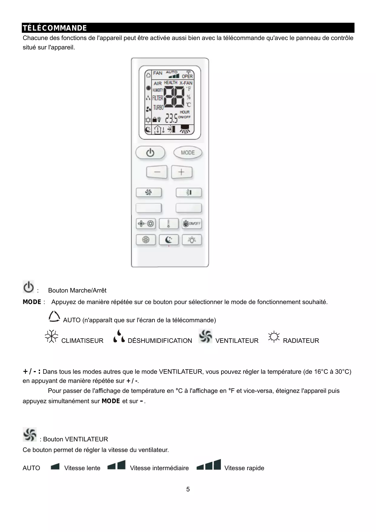 Bouton Marche/Arrêt MODE : Appuyez de manière répétée sur ce bouton pour sélectionner le mode de fonctionnement souhaité. AUTO (n'apparaît que sur l'écran de la télécommande) CLIMATISEUR DÉSHUMIDIFICATION VENTILATEUR RADIATEUR + / - : Dans tous les modes autres que le mode VENTILATEUR, vous pouvez régler la température (de 16°C à 30°C) en appuyant de manière répétée sur + / -. Pour passer de l'affichage de température en °C à l'affichage en °F et vice-versa, éteignez l'appareil puis appuyez simultanément sur MODE et sur –. : Bouton VENTILATEUR Ce bouton permet de régler la vitesse du ventilateur. AUTO Vitesse lente Vitesse intermédiaire