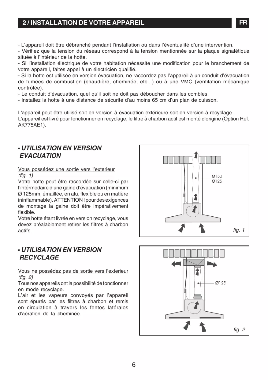 - L’appareil doit être débranché pendant l’installation ou dans l’éventualité d’une intervention. - Vérifiez que la tension du réseau correspond à la tension mentionnée sur la plaque signalétique située à l’intérieur de la hotte. - Si l’installation électrique de votre habitation nécessite une modification pour le branchement de votre appareil, faites appel à un électricien qualifié. - Si la hotte est utilisée en version évacuation, ne raccordez pas l’appareil à un conduit d’évacuation de fumées de combustion (chaudière, cheminée, etc...) ou à une VMC (ventilation mécanique contrôlée). - Le conduit d’évacuation, quel qu’il soit ne doit pas déboucher dans les combles. - Installez la hotte à une distance de sécurité d’au moins 65 cm d’un plan de cuisson. L'appareil peut être utilisé soit en version à évacuation extérieure soit en version à recyclage. L’appareil est livré pour fonctionner en recyclage, le filtre à charbon actif est monté d’origine (Option Ref. AK775AE1).