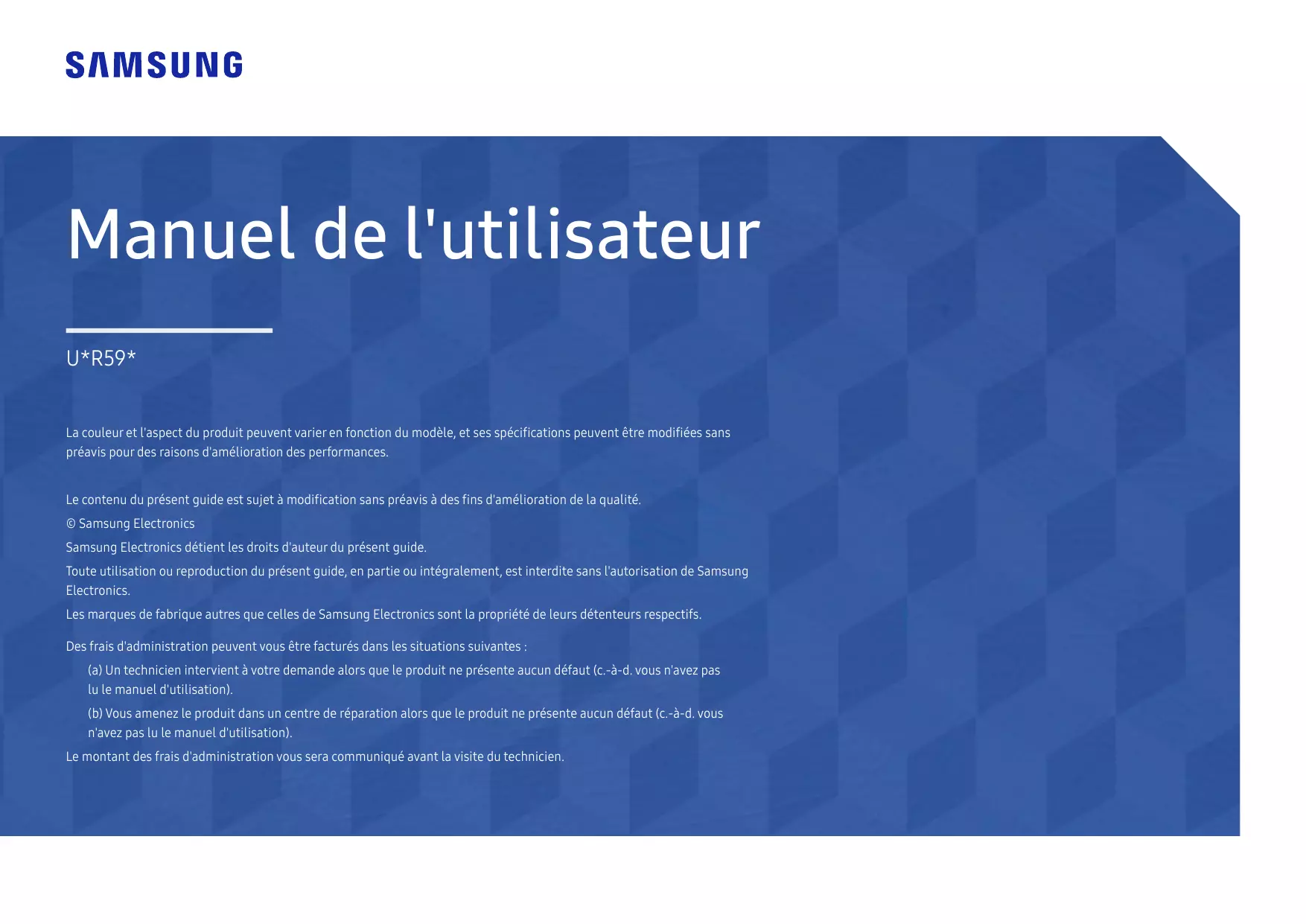 Manuel de l'utilisateur U*R59* La couleur et l'aspect du produit peuvent varier en fonction du modèle, et ses spécifications peuvent être modifiées sans préavis pour des raisons d'amélioration des performances. Le contenu du présent guide est sujet à modification sans préavis à des fins d'amélioration de la qualité. © Samsung Electronics Samsung Electronics détient les droits d'auteur du présent guide. Toute utilisation ou reproduction du présent guide, en partie ou intégralement, est interdite sans l'autorisation de Samsung Electronics. Les marques de fabrique autres que celles de Samsung Electronics sont la propriété de leurs détenteurs respectifs. Des frais d'administration peuvent vous être facturés dans les situations suivantes : (a) Un technicien intervient à votre demande alors que le produit ne présente aucun défaut (c.-à-d. vous n'avez pas lu le manuel d'utilisation). (b) Vous amenez le produit dans un centre de réparation alors que le produit ne présente aucun défaut (c.-à-d. vous n'avez pas lu le manuel d'utilisation). Le montant des frais d'administration vous sera communiqué avant la visite du technicien. Table des matières Avant utilisation du produit Sécurisation de l'espace d'installation Précautions de stockage Consignes de sécurité Nettoyage Électricité et sécurité Installation Fonctionnement