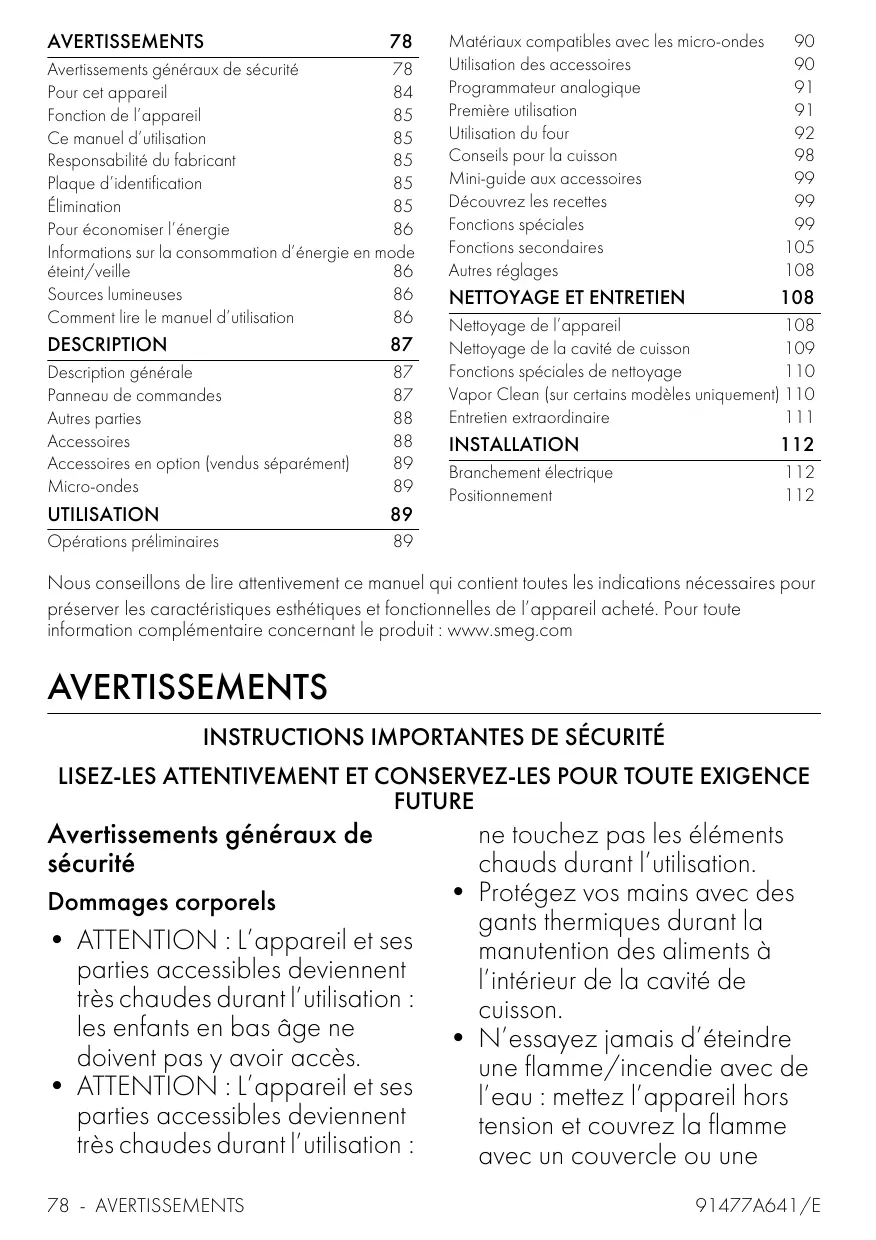 Nous conseillons de lire attentivement ce manuel qui contient toutes les indications nécessaires pour préserver les caractéristiques esthétiques et fonctionnelles de l’appareil acheté. Pour toute information complémentaire concernant le produit : www.smeg.com AVERTISSEMENTS