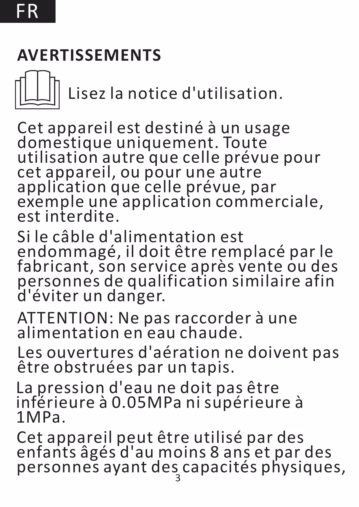 | Sécurité | Système de verrouillage de porte, protection contre les fuites d'eau |