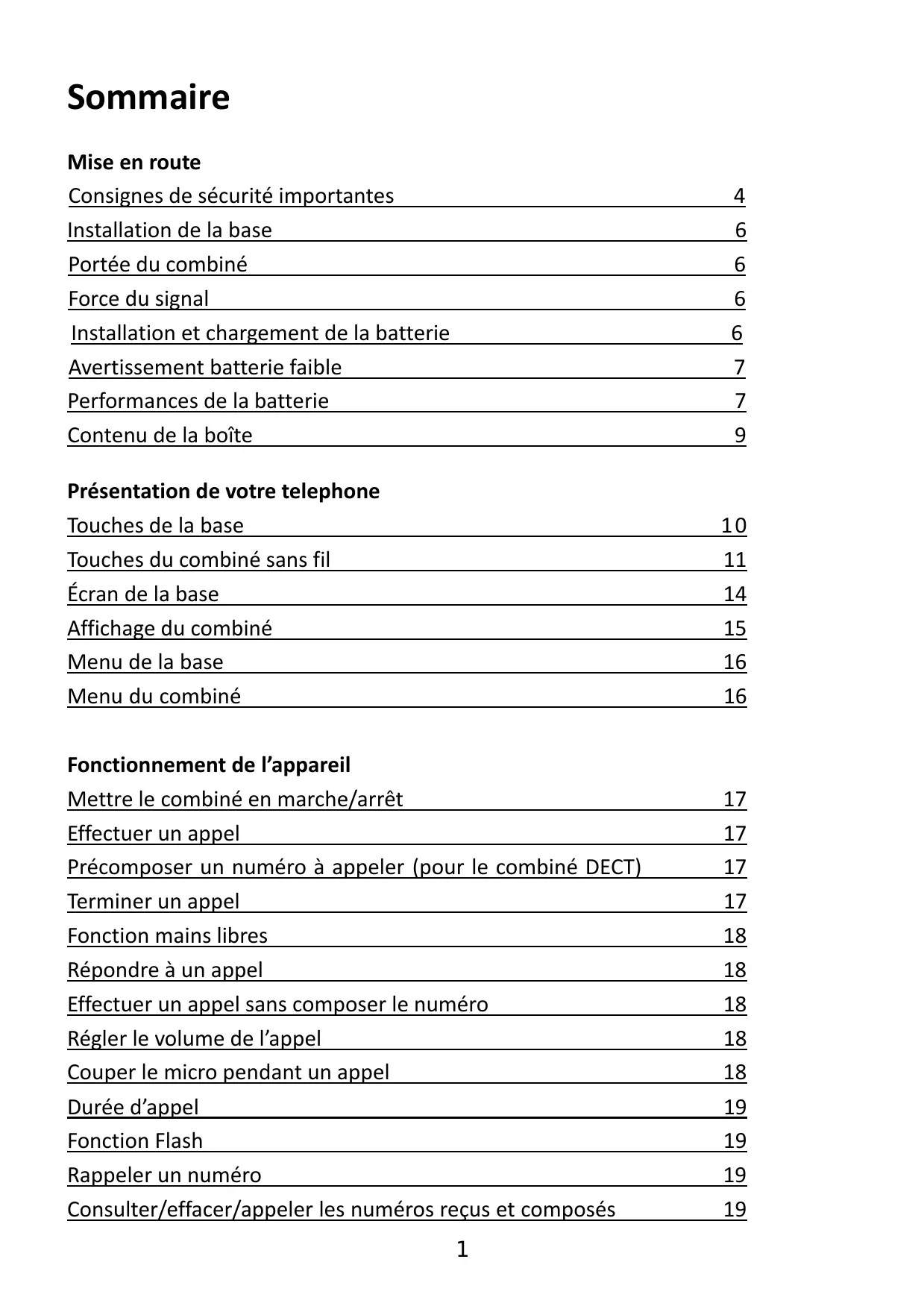 Fonctionnement de l’appareil Mettre le combiné en marche/arrêt Effectuer un appel Précomposer un numéro à appeler (pour le combiné DECT) Terminer un appel Fonction mains libres Répondre à un appel Effectuer un appel sans composer le numéro Régler le volume de l’appel Couper le micro pendant un appel Durée d’appel Fonction Flash Rappeler un numéro Consulter/effacer/appeler les numéros reçus et composés