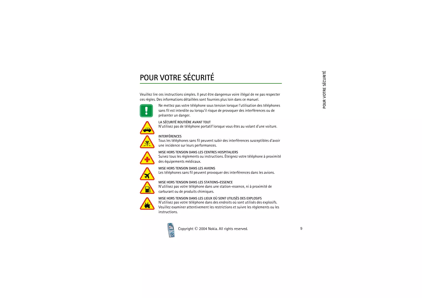 POUR VOTRE SÉCURITÉ Veuillez lire ces instructions simples. Il peut être dangereux voire illégal de ne pas respecter ces règles. Des informations détaillées sont fournies plus loin dans ce manuel. Ne mettez pas votre téléphone sous tension lorsque l'utilisation des téléphones sans fil est interdite ou lorsqu'il risque de provoquer des interférences ou de présenter un danger.