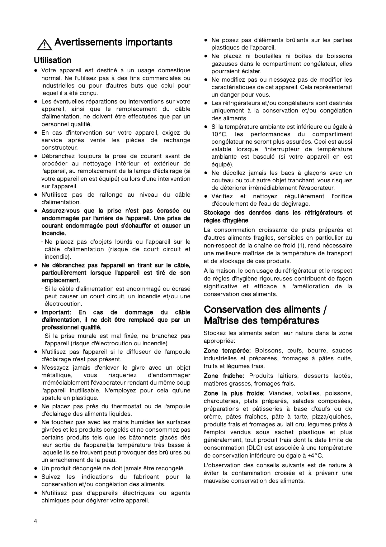 Ne posez pas d'éléments brûlants sur les parties plastiques de l'appareil. Ne placez ni bouteilles ni boîtes de boissons gazeuses dans le compartiment congélateur, elles pourraient éclater. Ne modifiez pas ou n'essayez pas de modifier les caractéristiques de cet appareil. Cela représenterait un danger pour vous. Les réfrigérateurs et/ou congélateurs sont destinés uniquement à la conservation et/ou congélation des aliments. Si la température ambiante est inférieure ou égale à 10°C, les performances du compartiment congélateur ne seront plus assurées. Ceci est aussi valable lorsque l'interrupteur de température ambiante est basculé (si votre appareil en est équipé). Ne décollez jamais les bacs à glaçons avec un couteau ou tout autre objet tranchant, vous risquez de détériorer irrémédiablement l'évaporateur. Vérifiez et nettoyez régulièrement l'orifice d'écoulement de l'eau de dégivrage. Stockage des denrées dans les réfrigérateurs et règles d'hygiène La consommation croissante de plats préparés et d'autres aliments fragiles, sensibles en particulier au non-respect de la chaîne de froid (1), rend nécessaire une meilleure maîtrise de la température de transport et de stockage de ces produits. A la maison, le bon usage du réfrigérateur et le respect de règles d'hygiène rigoureuses contribuent de façon significative et efficace à l'amélioration de la conservation des aliments. Conservation des aliments / Maîtrise des températures Stockez les aliments selon leur nature dans la zone appropriée: Zone tempérée: Boissons, œufs, beurre, sauces industrielles et préparées, fromages à pâtes cuite, fruits et légumes frais. Zone fraîche: Produits laitiers, desserts lactés, matières grasses, fromages frais. Zone la plus froide: Viandes, volailles, poissons, charcuteries, plats préparés, salades composées, préparations et pâtisseries à base d'œufs ou de crème, pâtes fraîches, pâte à tarte, pizza/quiches, produits frais et fromages au lait cru, légumes prêts à l'emploi vendus sous sachet plastique et plus généralement, tout produit frais dont la date limite de consommation (DLC) est associée à une température de conservation inférieure ou égale à +4°C. L'observation des conseils suivants est de nature à éviter la contamination croisée et à prévenir une mauvaise conservation des aliments. Emballer systématiquement les produits pour éviter que les denrées ne se contaminent mutuellement. Se laver les mains avant de toucher les aliments et plusieurs fois pendant la préparation du repas si celleci implique des manipulations successives de produits différents, et après, bien sûr, au moment de passer à table comme les règles d'hygiène l'imposent. Ne pas réutiliser des ustensiles ayant déjà servi (cuillère en bois, planche à découper sans les avoir bien nettoyés au préalable). Attendre le refroidissement complet des préparations avant de les stocker (exemple: soupe). Limiter le nombre d'ouvertures de la porte et, en tout état de cause, ne pas la laisser ouverte trop longtemps pour éviter une remontée en température du réfrigérateur. Disposer les aliments de telle sorte que l'air puisse circuler librement tout autour. Il convient de vérifier régulièrement que la température, notamment celle de la zone la plus froide, est correcte et le cas échéant, d'ajuster le thermostat en conséquence comme indiqué (page «UTILISATION»). La mesure de la température dans une zone (sur une clayette, par exemple) peut se faire au moyen d'un thermomètre placé, dès le départ, dans un récipient rempli d'eau (verre). Pour avoir une représentation fidèle de la réalité, lisez la température sans manipulation des commandes ni ouverture de porte. Respect des règles d'hygiène Nettoyez fréquemment l'intérieur du réfrigérateur en utilisant un produit d'entretien doux sans effet oxydant sur les parties métalliques, puis rincer avec de l'eau additionnée de jus de citron, de vinaigre blanc ou avec tout produit désinfectant adapté au réfrigérateur. Retirez les suremballages du commerce avant de placer les aliments dans le réfrigérateur (par exemple suremballages des packs de yaourts). Couvrez les aliments. Consultez la notice d'utilisation de l'appareil en toutes circonstances et en particulier pour les conseils d'entretien. 1 ) Chaîne de froid : maintien sans rupture de la température requise d'un produit, depuis sa préparation et son conditionnement jusqu'à son utilisation par le consommateur. Sécurité des enfants Ne laissez pas à la portée des enfants les différents emballages. Cet appareil a été conçu pour être utilisé par des adultes. Veillez à ce que les enfants n'y touchent pas et ne l'utilisent pas comme un jouet. Cet appareil est muni de fermetures magnétiques. S'il remplace un appareil équipé d'une fermeture à ressort, nous vous conseillons de rendre celle-ci inutilisable avant de vous en débarrasser, ceci afin d'éviter aux enfants de s'enfermer dans l'appareil et de mettre ainsi leur vie en danger. Veillez également à couper le câble d'alimentation électrique au ras de l'appareil. Installation Placez l'appareil dos au mur pour éviter tout contact avec le compresseur et le condenseur. Retirez la prise avant de déplacer l'appareil. Assurez-vous après avoir déplacé l'appareil, que celui-ci ne repose pas sur le câble d'alimentation. Cet appareil est lourd. Faites attention lors de son déplacement. L'appareil se réchauffe sensiblement au niveau du condenseur et du compresseur. Veillez à ce que l'air circule librement tout autour de l'appareil. Une ventilation insuffisante entraînerait un mauvais fonctionnement et des dommages sur l'appareil. Protection de l'environnement Le système frigorifique et l'isolation de votre appareil ne contiennent pas de C.F.C., contribuant ainsi à préserver l'environnement. Les C.F.C. sont remplacés par des hydrocarbures