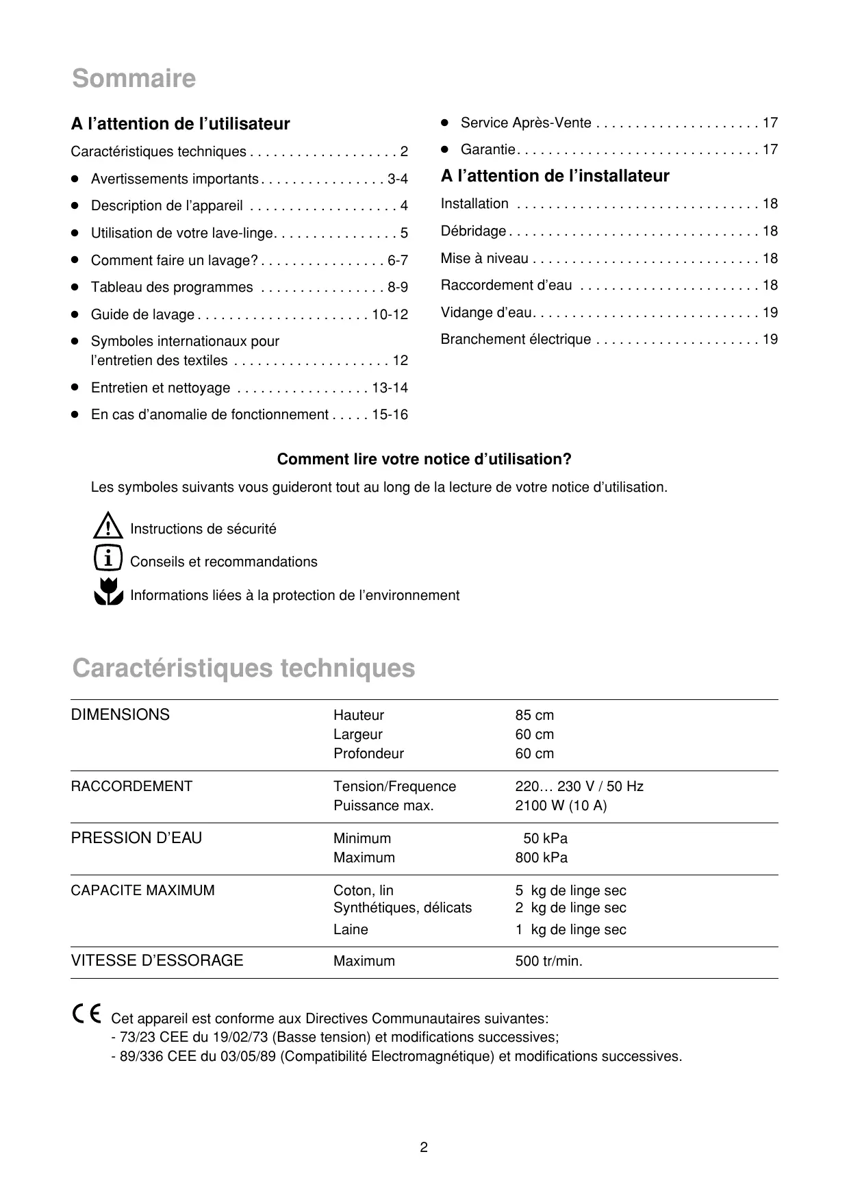 Service Après-Vente . . . . . . . . . . . . . . . . . . . . . 17 Caractéristiques techniques . . . . . . . . . . . . . . . . . . . 2