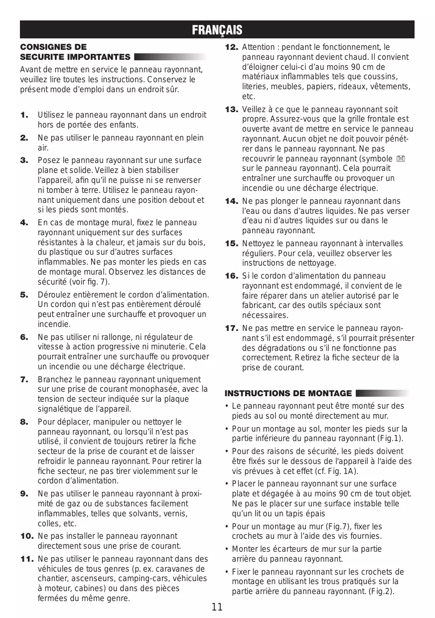 CONSIGNES DE SECURITE IMPORTANTES Avant de mettre en service le panneau rayonnant, veuillez lire toutes les instructions. Conservez le présent mode d’emploi dans un endroit sûr. 1.