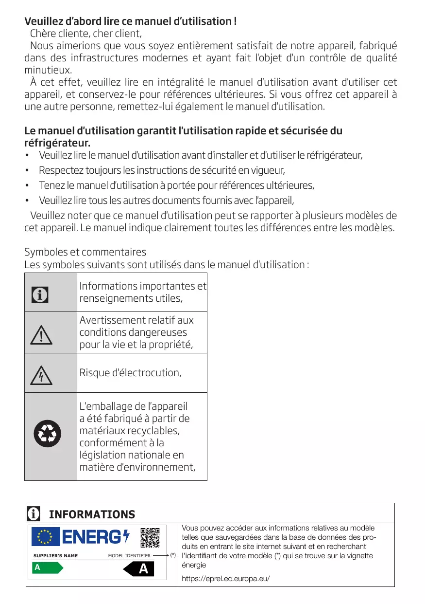 Bitte lesen Sie die folgenden Hinweise aufmerksam durch. Bei Nichtbeachtung dieser Angaben kann es zu Verletzungen und Sachschäden kommen. In diesem Fall erlöschen auch sämtliche Garantieund sonstigen Ansprüche. Kompressor bei kurzzeitigen Unterbrechungen der Stromversorgung und wenn das Gerät zu oft und schnell ein- und ausgeschaltet wird, da der Druck des Kühlmittels eine Weile lang ausgeglichen werden muss. Der Kühlschrank beginnt nach etwa sechs Minuten wieder zu arbeiten. Bitte wenden Sie sich an den Le manuel d'utilisation garantit l'utilisation rapide et sécurisée du réfrigérateur. • Veuillez lire le manuel d'utilisation avant d'installer et d'utiliser le réfrigérateur, • Respectez toujours les instructions de sécurité en vigueur, • Tenez le manuel d'utilisation à portée pour références ultérieures, • Veuillez lire tous les autres documents fournis avec l'appareil, Veuillez noter que ce manuel d'utilisation peut se rapporter à plusieurs modèles de cet appareil. Le manuel indique clairement toutes les différences entre les modèles. Symboles et commentaires Les symboles suivants sont utilisés dans le manuel d'utilisation :