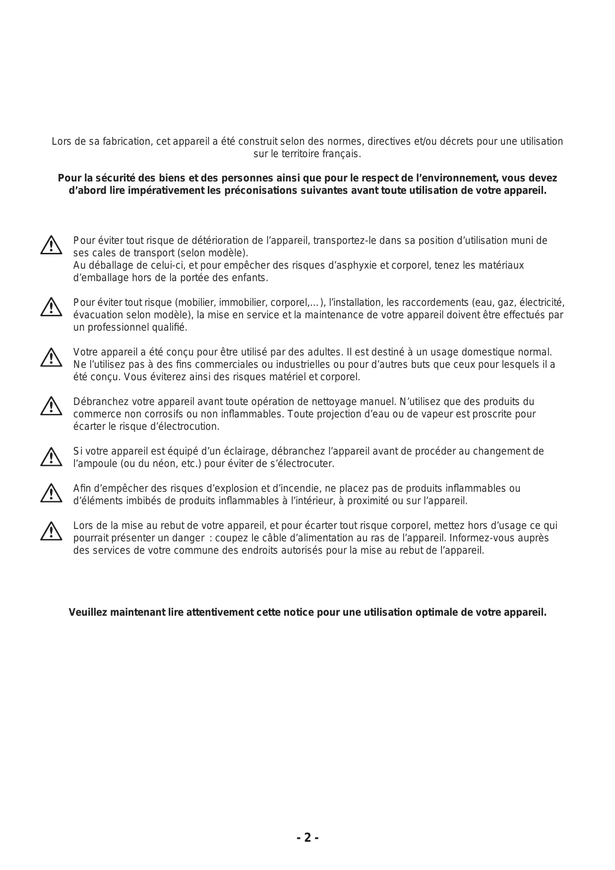 822 61 11-21 Cet appareil doit être installé par une personne qualifiée et selon les normes en vigueur. Avertissements importants Conservez cette notice d’utilisation avec l’appareil. Si l’appareil devait être vendu ou cédé à une autre personne, assurez-vous que la notice d’utilisation l’accompagne. Le nouvel utilisateur pourra alors être informé du fonctionnement de celui-ci et des avertissements s’y rapportant. Ces avertissements ont été rédigés pour votre sécurité et celle d’autrui. Installation et maintenance
